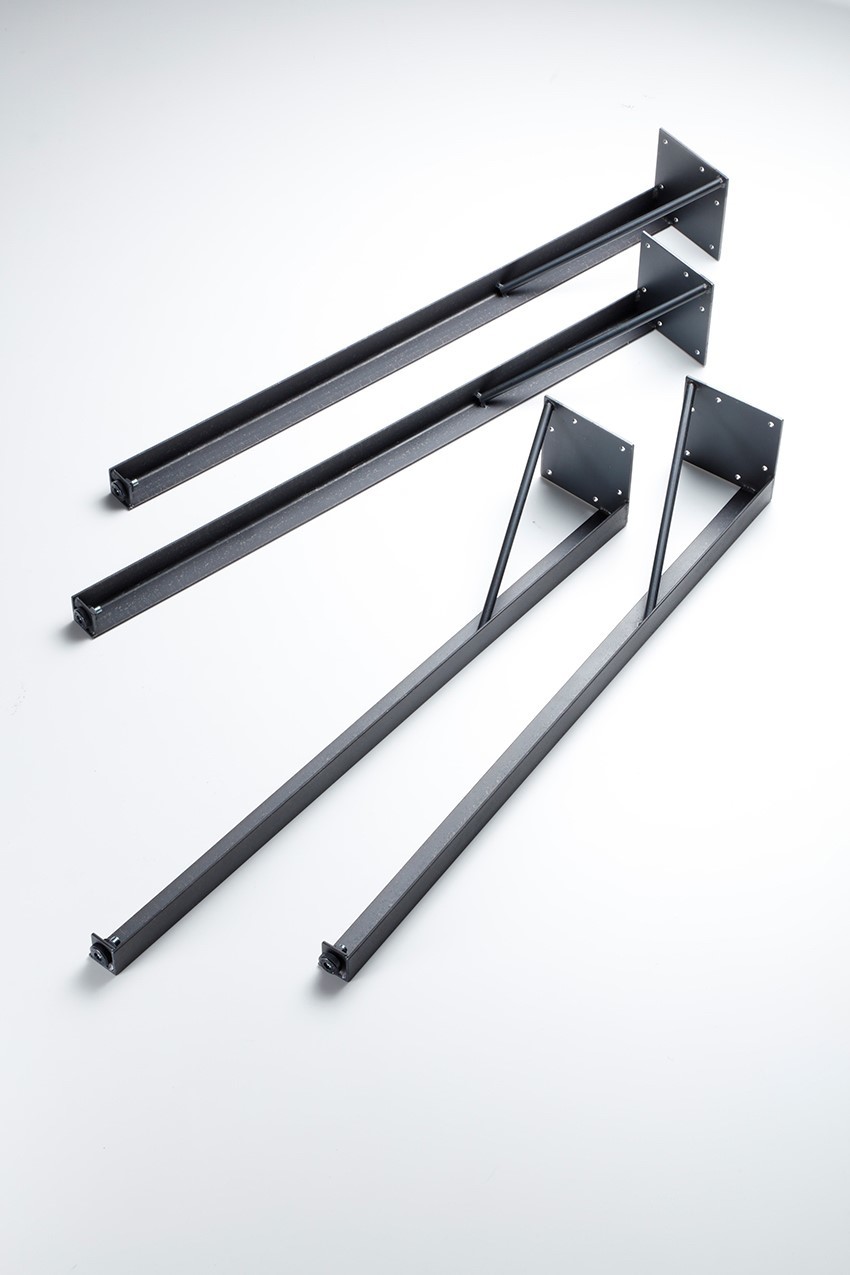 | Q:天板サイズが30mm×1500×600で、鉄脚の高さが900mmのカウンターや(作業台)を作ろうと考えておりますが、揺れの出ない方法はありますか? | と、いうような方のために、下図のような足元補強パーツも製作させて頂いております。ご希望の場合はお問い合わせ頂ければ詳細図を書かせて頂きますので、天板サイズなどを明記の上、ご相談ください。脚4本をつなぐことにより、安定感のある仕上がりになります。ビス固定式でお作りいたします。製作費はサイズにより変動いたしますが、足元補強パーツ一式で+¥7,000~¥8,000-前後(税別)見ておいて頂けたらと思います。ただし、郵送について問題があります。一辺が1700mmを超えるサイズのものは宅急便では受付け不可となります。お問い合わせを頂いた段階で郵送の可否をお伝えさせて頂きますが、補強パーツの長さが1700mmを超える場合は、お引き取りのみでの対応になります。