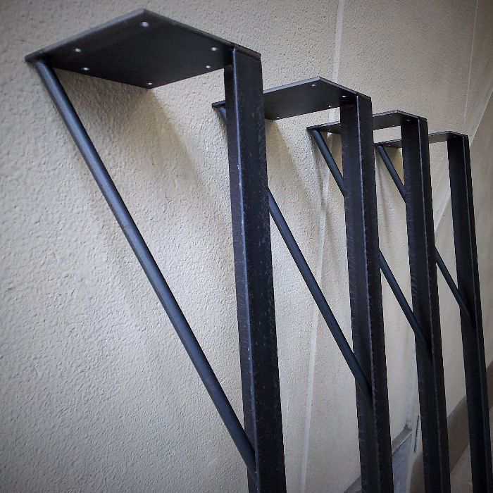 DIYテーブル用・Lアングル鉄脚・丸棒付きタイプは、3.2mm厚のスチールプレートに補強を兼ねた丸棒の飾りを溶接したデザイン。丸棒のつっかえ位置はご注文を頂いた鉄脚高さのしたから大体2/3程度のバランスになるように溶接をしております。スチールプレートとLアングルの溶接部分は溶接しっぱなしにしており、『溶接ビート』と呼ばれる波状の溶接跡が粗雑感をかもだします。天板固定部はプレートなので、コーナー部でも内側に入った位置でもお好きな位置に取付けが可能です。高さ710mm以下までは同額にてお作りをさせて頂きます(711mm以上については要・追加料金)。Lアングルは3mm厚×30×30mmの材料サイズなので30mm前後の木天板だと見た目がよい仕上がりになると思います。