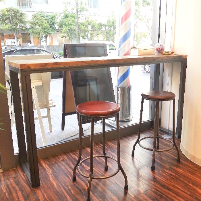 ロアーコーヒーハウス&ロースタリー様(中央区八丁堀)からのご注文で、お店に設置するハイテーブルを製作させて頂きました。Lアングル鉄脚・鋲付きタイプをきちんとしたテーブル使用で作るとこのような感じになります。