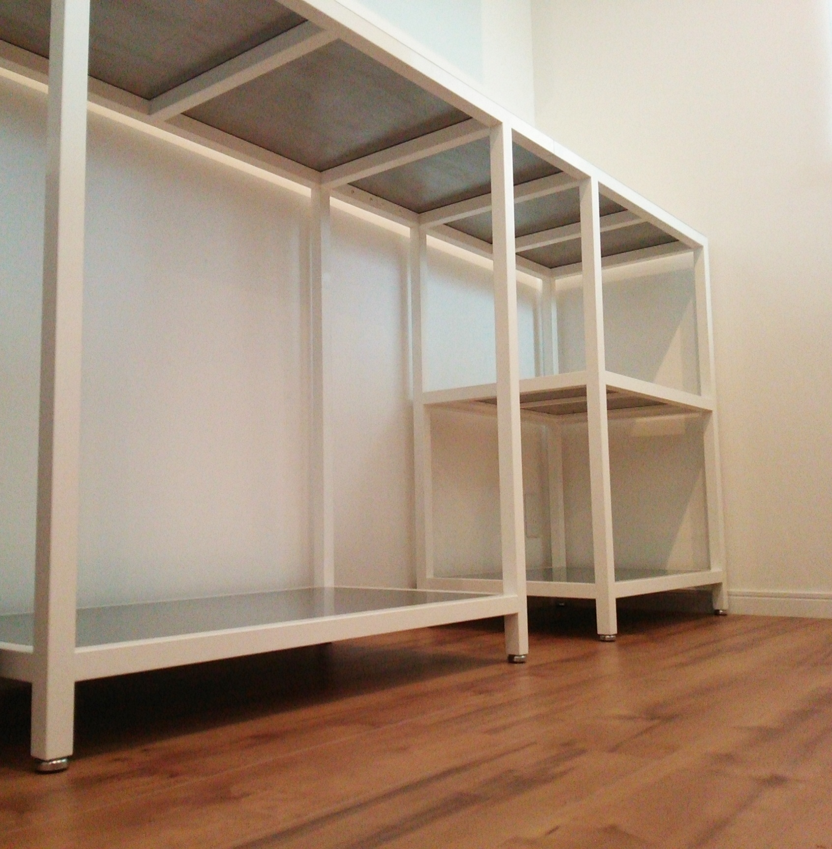 大田区K様からのご依頼で特注の料理台を製作させて頂きました。角パイプフレームは白の粉体焼付塗装仕上げ、そして料理台としてご使用になられるということで、ステンレスの板を天板として用い、清潔でキレイなイメージに仕上がりました。ご自宅入口の搬入ルートの都合で、センター中央部で分かれる2分割式の組み立て式で作らせて頂きました。