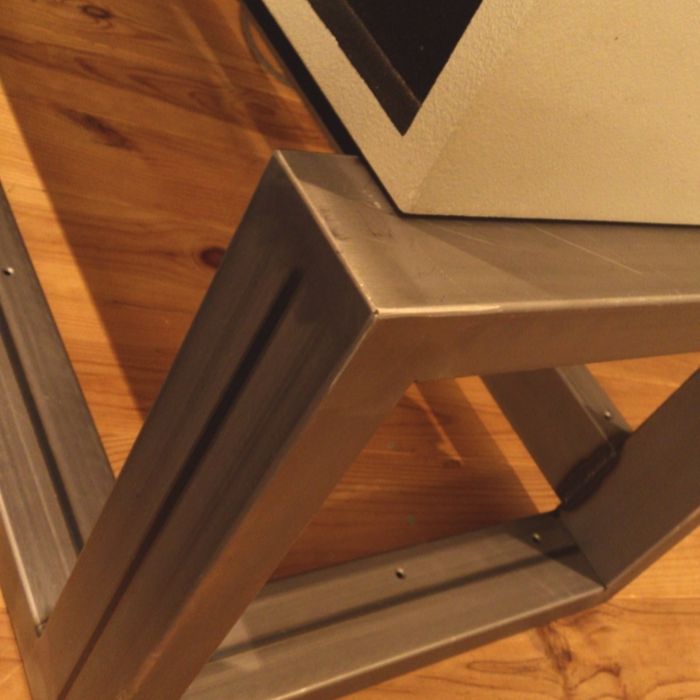 テーブルサイズはW600×D600×H1000(mm)にて作らせて頂いたところ、背の高いデザインなので脚が4本だけではどうしてもフラつきが生じたため、足元に丸棒で十字型の補強を溶接させて頂きました。ハイテーブルなのでお客様が脚を載せるのにもちょうどよくなり、デザイン的にもスタイリッシュな印象に仕上がりました。