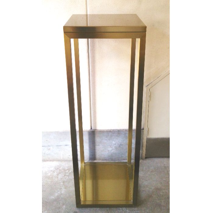 世界的チェーンの某有名企業様から『トロフィーの展示台を真鍮で作ってほしい』というご相談を頂きました。真鍮でこの写真のような展示台は弊社では製作できないため、全てステンレスのヘアライン仕上げで作り上げたあとに、特注の色で焼付塗装を施して真鍮風に仕上げました。上面部には穴をあけて下からトロフィーをビス固定して倒れないようにしました。