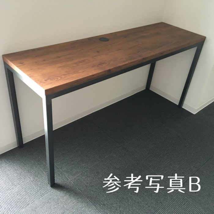 天板はワイド2400mmの一枚板を3つのフレームで支えております。19×19角パイプを用いてクリヤーの焼付け塗装で仕上げさせて頂きました。無機質なクリヤー仕上げと木材の組み合わせがクールな印象を抱かせてくれます。