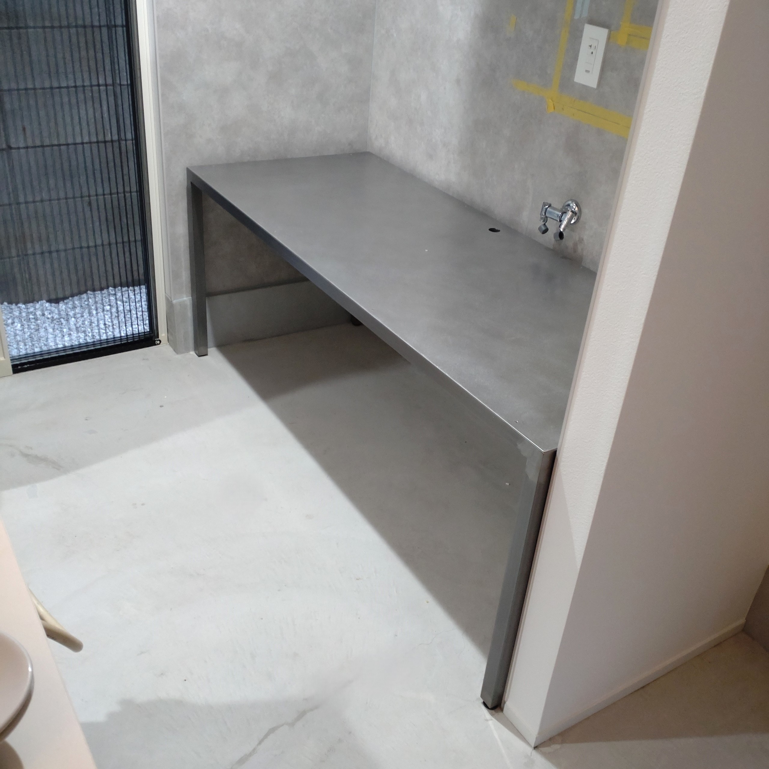 「料理教室用のガス台をピッタリサイズで作りたい」とのご依頼を頂いたのはフードスタイリストとして多くの書籍出版や雑誌のスタイリングもされているダンノマリコ様。ガス台の天板はサビや汚れに強いステンレスの板をバイブレーション仕上げ。フレームは製作コストを抑えるためにスチール角パイプをクリヤー焼付塗装して見た目に統一感を出しました。天板にはガス管を通すために30φの穴加工をしております。フレームの方にタップ加工(ネジ切り)をして天板とビス固定をして完成です。バイブレーション仕上げとは無研磨の板(写真参照)にランダムな円弧状の研磨目を無数につける仕上げ方でキズが目立ちにくく、マットな風合いになります。ミラタップさんなどの高級キッチンカウンタートップの加工方法でも採用されている手法です。既製品ではあまり見かけない理由は、手間がかかるリッチな仕上げなのです。たまに角パイプでもこの仕上げをしてほしいという方がおりますがひたすら研磨するため製作コストが増します。しかし、かっこいいです。弊社工場の看板にも採用しています。