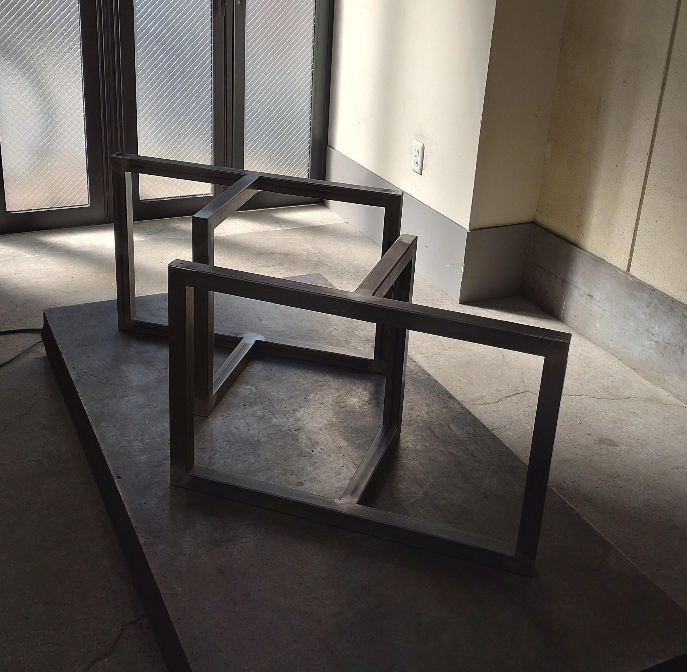 練馬区O様からのご依頼で、変わった形状のテーブルフレーム脚を製作させて頂きました。天板が写真のような曲線を帯びた形状、そして天板外側から30cmオフセットした寸法で、どこの位置にもイスを置ける形状にされたいというご要望でした。フレーム自体は上面から見ると台形のような形、床面はハの字にヨコ柱がついた形にさせて頂きました。