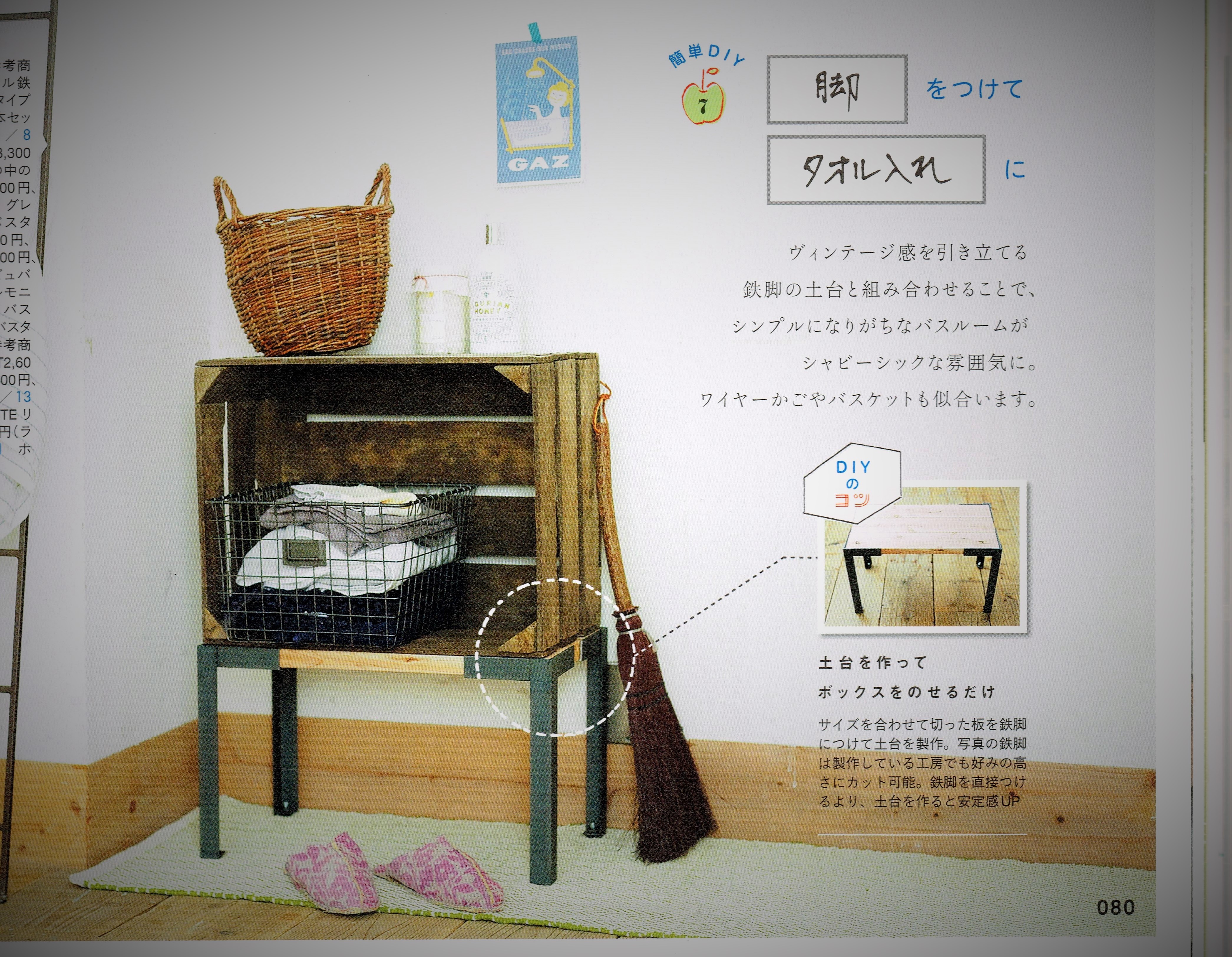 以前、雑誌にも取り上げて頂いたのですが、リンゴの木箱に鉄脚を取り付けてちょっとした収納棚にする、なんてのもオシャレです。全て手作業で丁寧に溶接してお作りをさせて頂きますので、あとはご自身で天板等にビス固定するだけ。以外とカンタンにDIYで鉄脚テーブルは作ることができるのです。