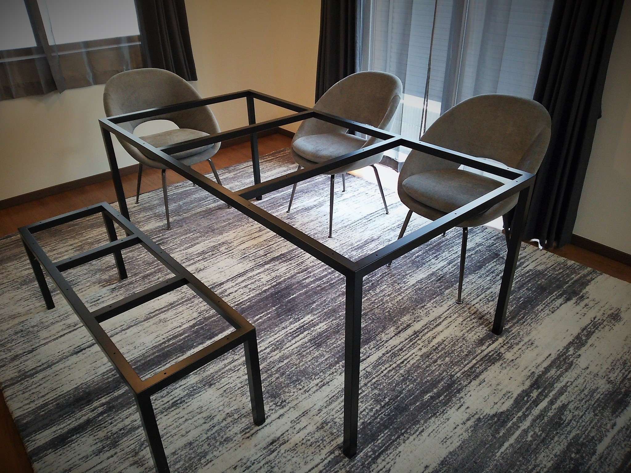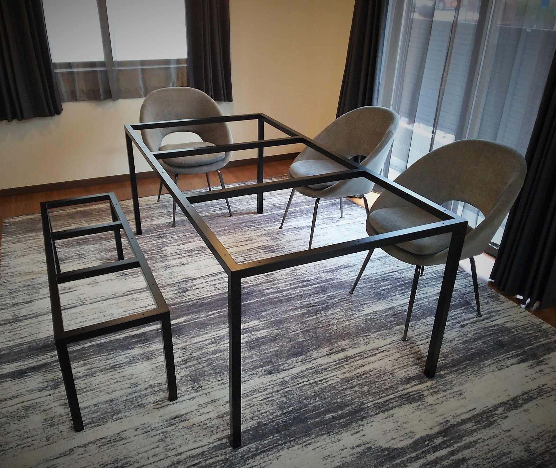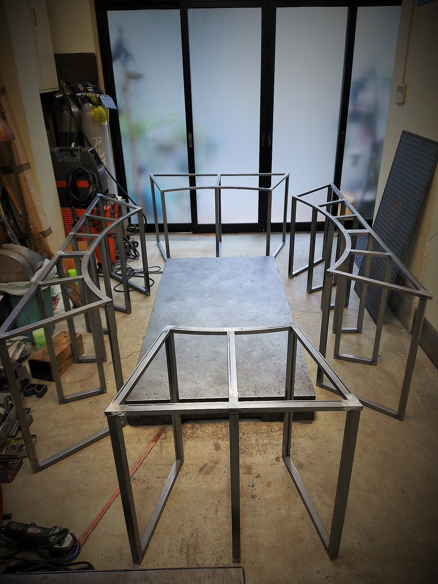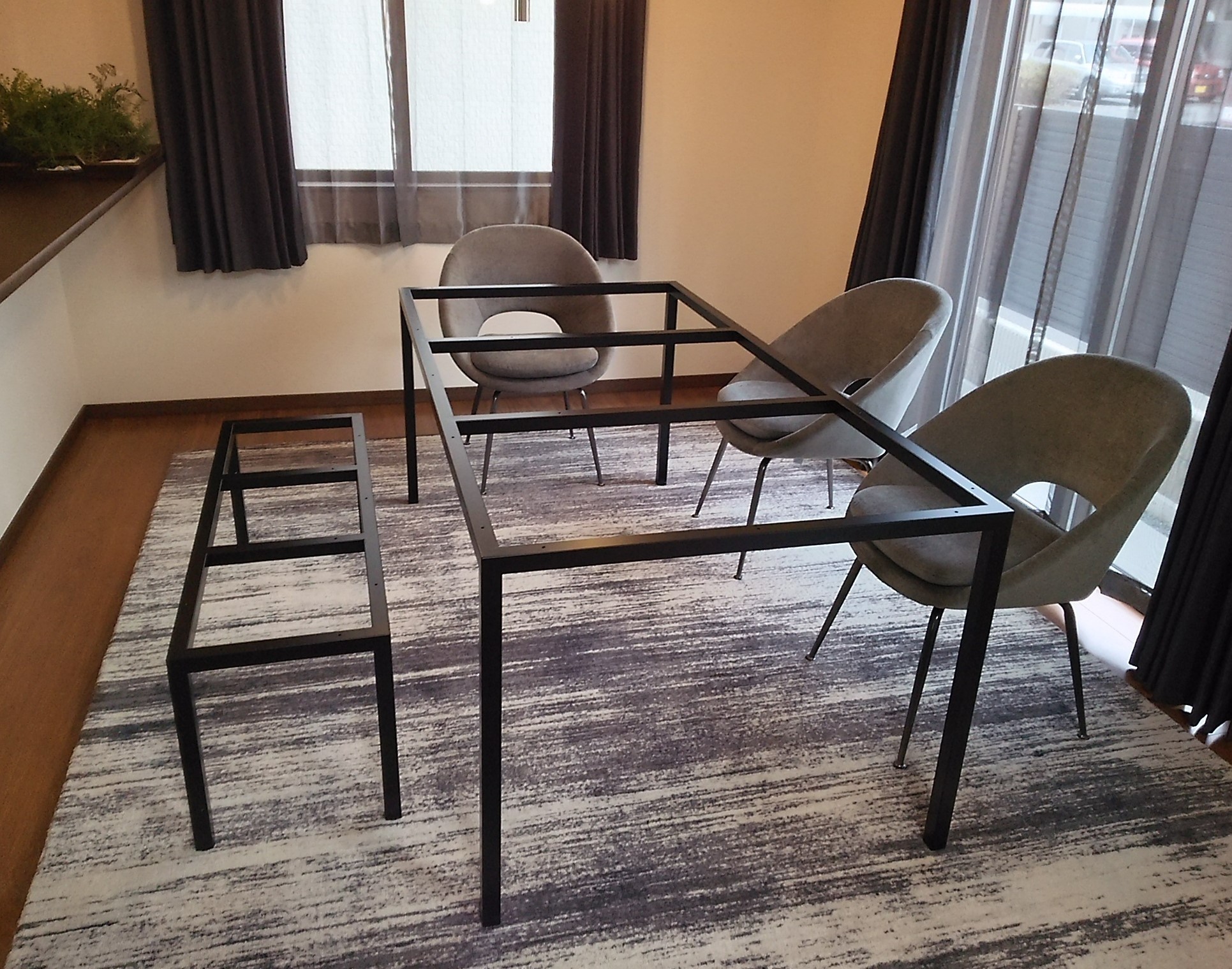 練馬区O様からのご依頼で、変わった形状のテーブルフレーム脚を製作させて頂きました。天板が写真のような曲線を帯びた形状、そして天板外側から30cmオフセットした寸法で、どこの位置にもイスを置ける形状にされたいというご要望でした。フレーム自体は上面から見ると台形のような形、床面はハの字にヨコ柱がついた形にさせて頂きました。