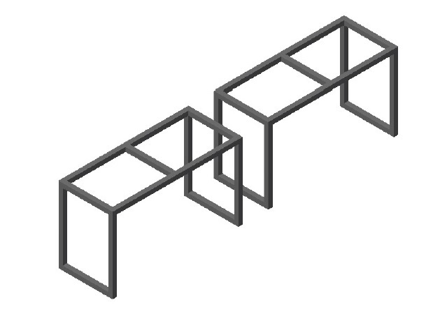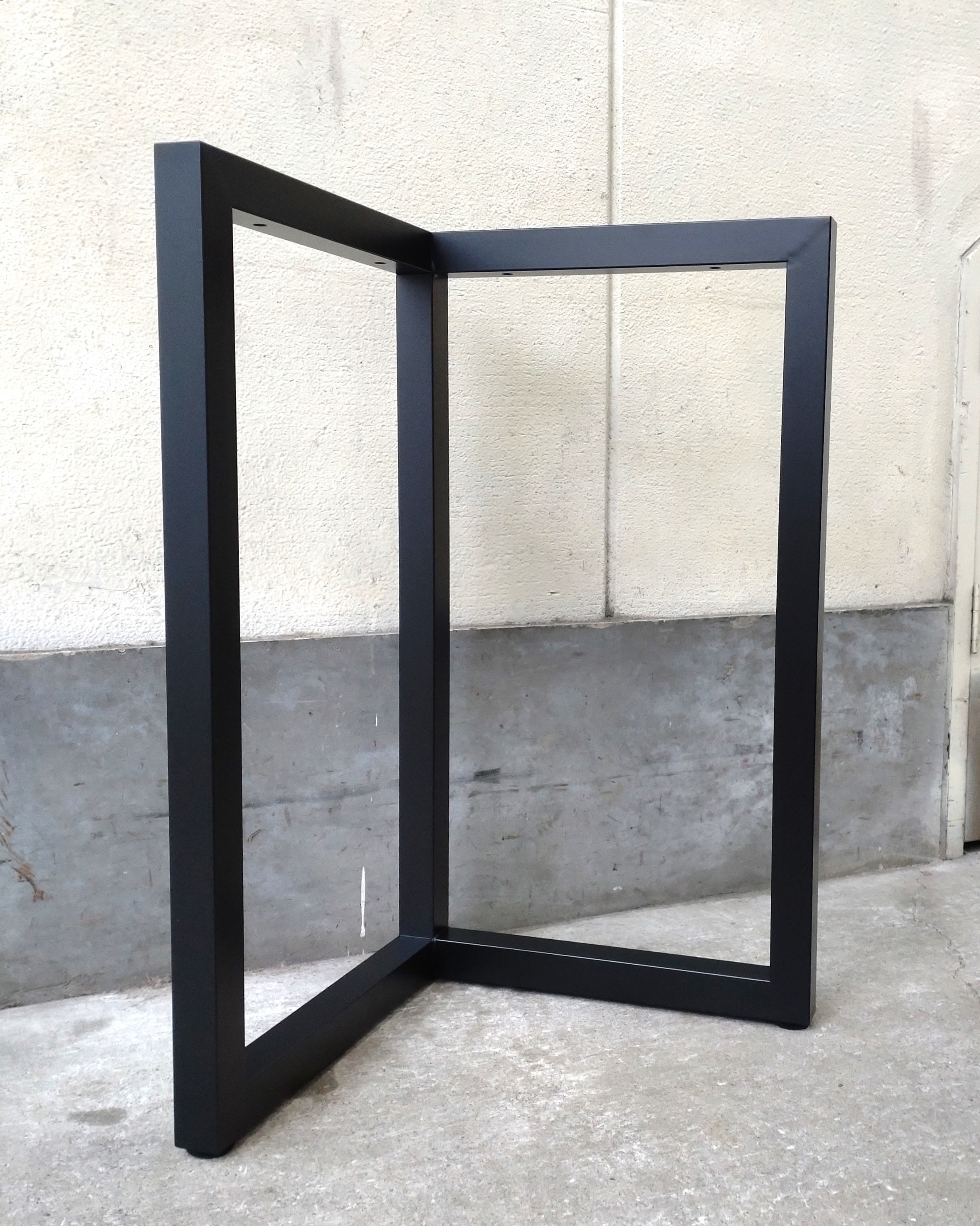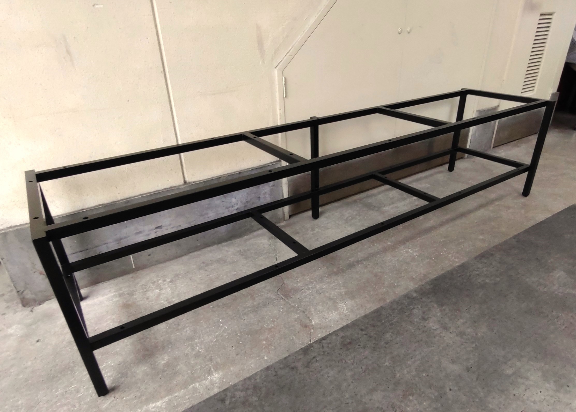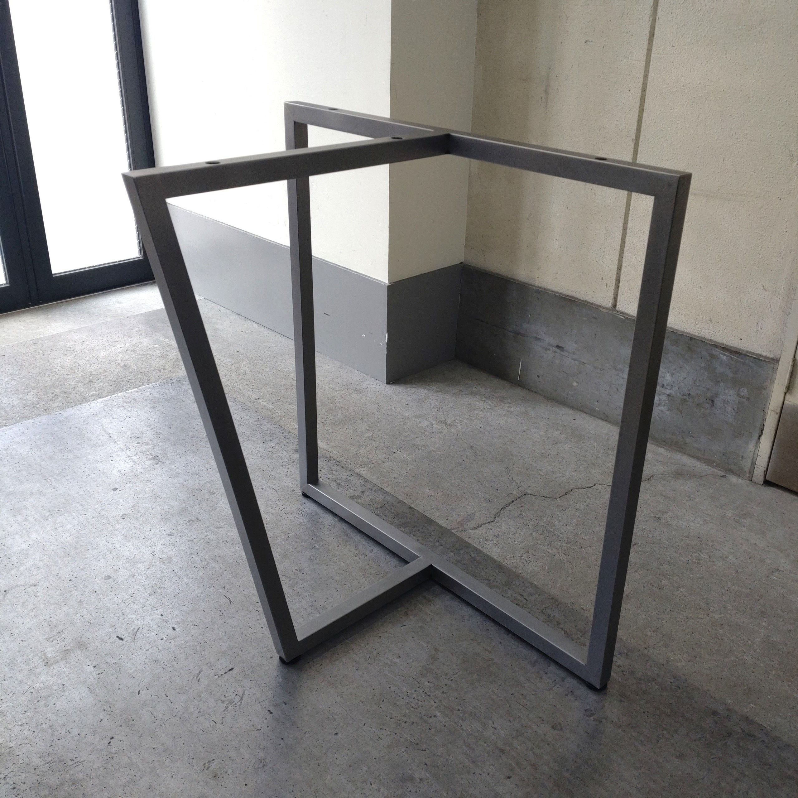 練馬区O様からのご依頼で、変わった形状のテーブルフレーム脚を製作させて頂きました。天板が写真のような曲線を帯びた形状、そして天板外側から30cmオフセットした寸法で、どこの位置にもイスを置ける形状にされたいというご要望でした。フレーム自体は上面から見ると台形のような形、床面はハの字にヨコ柱がついた形にさせて頂きました。