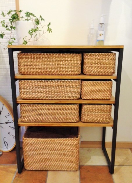 この作り方は本棚にもよいと思います。ワイドの長いアイアンラックをお作りになられたい場合は、このハシゴフレームの数を増やして天板が垂れないようにする、という作り方もよいと思います。