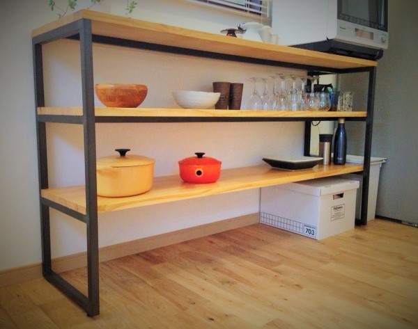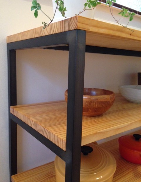 横浜在住の個人の方からのご依頼でマンションのリノベーションに伴い、インダストリアルなキッチンフレームを角パイプで製作させて頂きました。黒皮(クロカワ)焼付け塗装仕上げで、鉄の風合いを残した仕上げにし、溶接跡もそのままのワイルドな仕上げとさせて頂きました。角パイプ脚にはゴツめの黒アジャスターを履かせ、全体的にクールな角パイプ什器になりました。