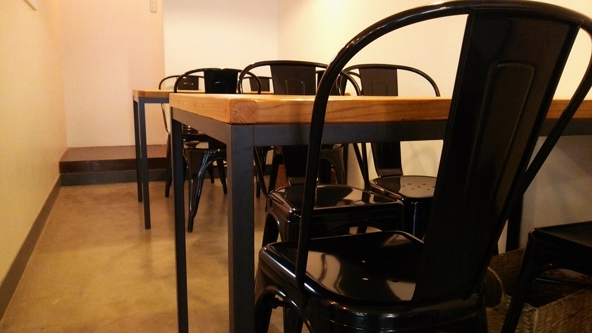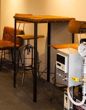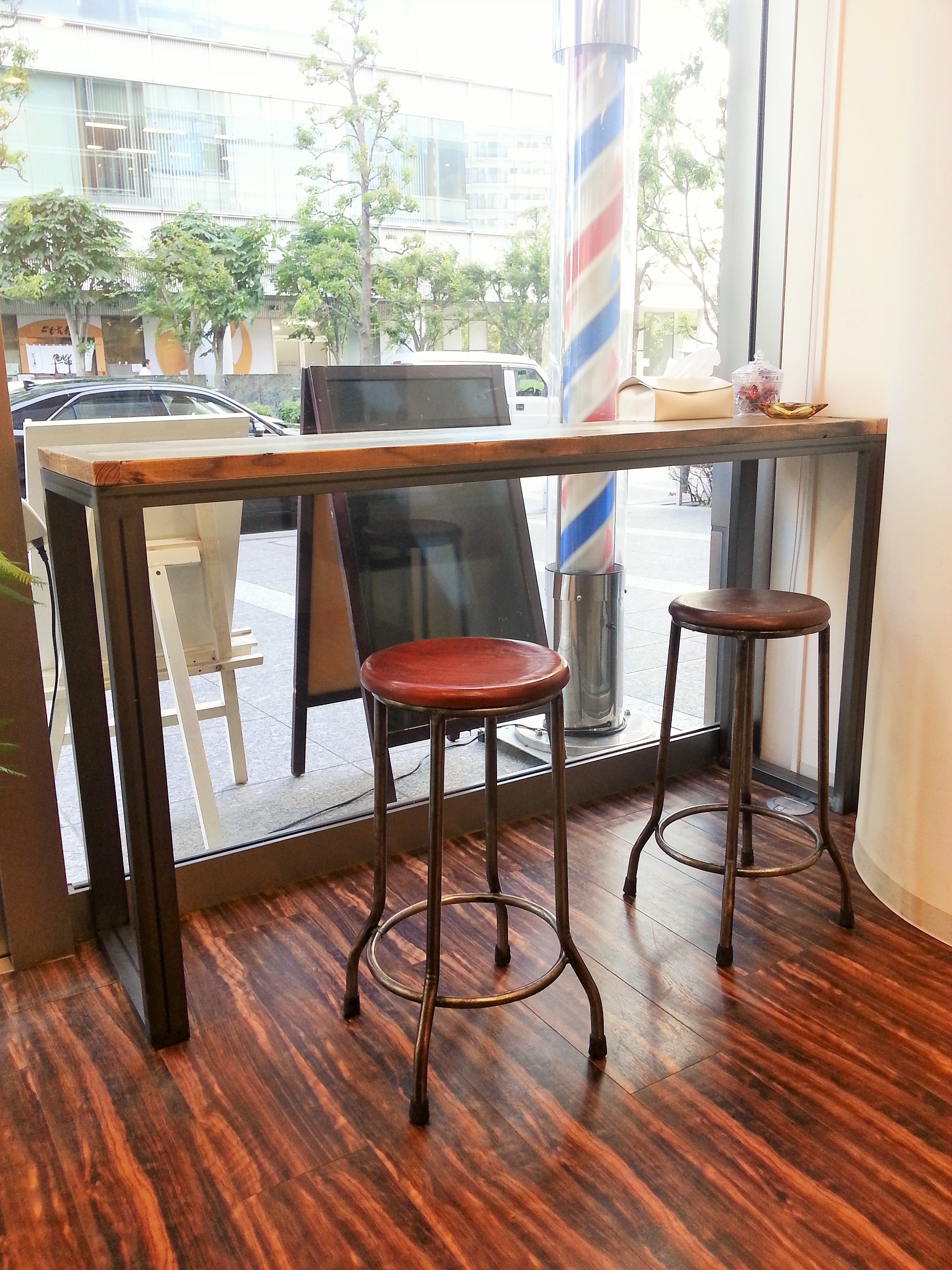 ロアーコーヒーハウス&ロースタリー様(中央区八丁堀)からのご注文で、お店に設置するハイテーブルを製作させて頂きました。Lアングル鉄脚・鋲付きタイプをきちんとしたテーブル使用で作るとこのような感じになります。