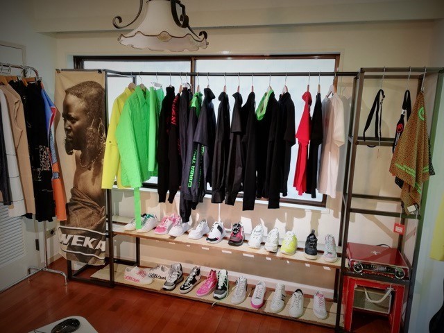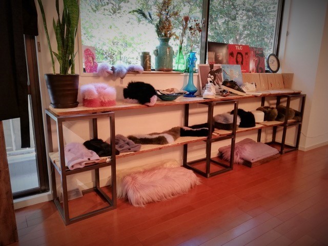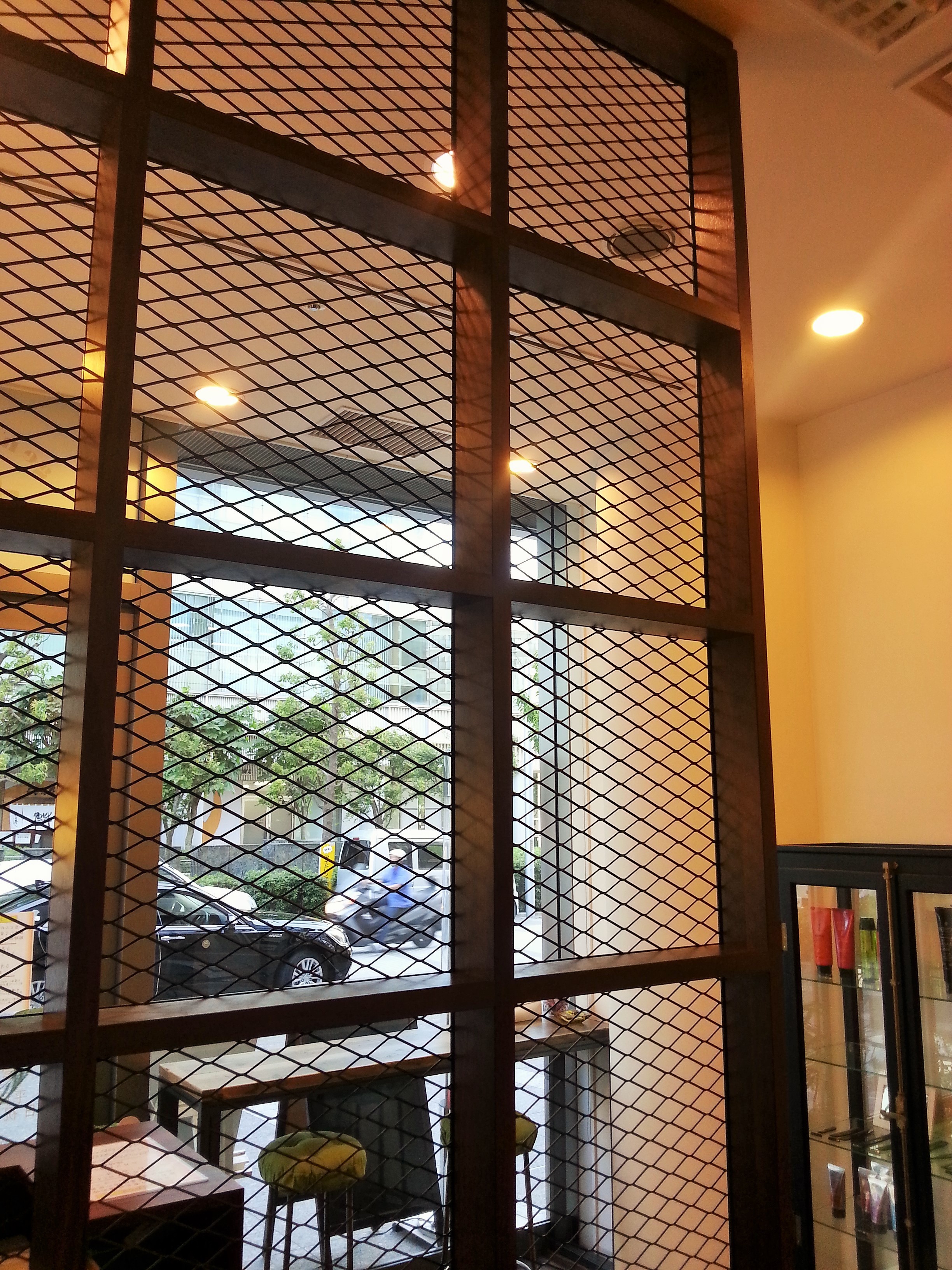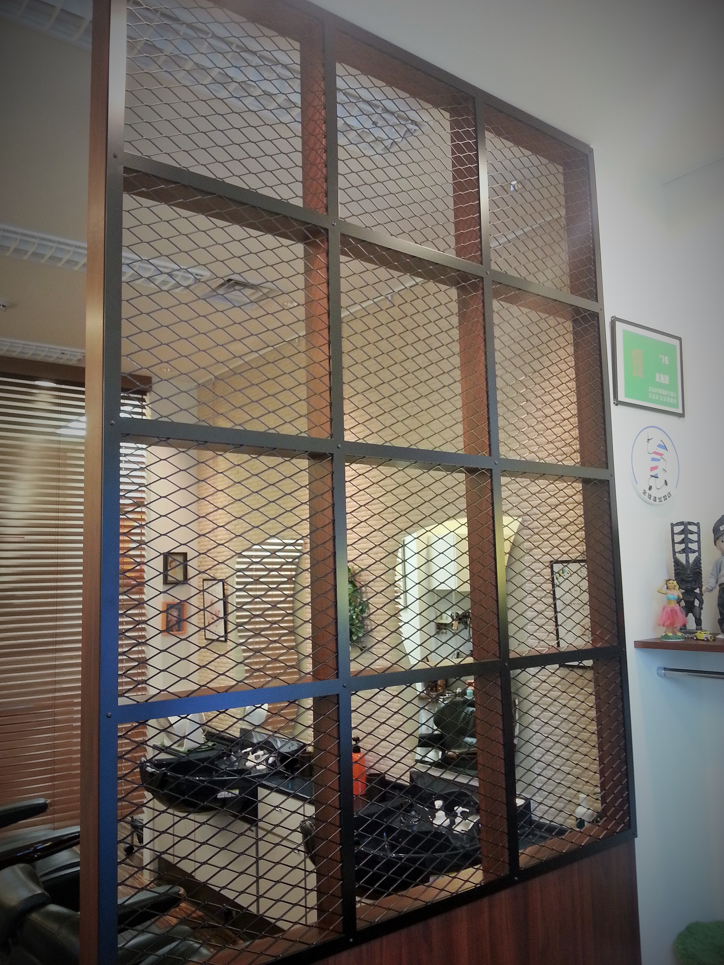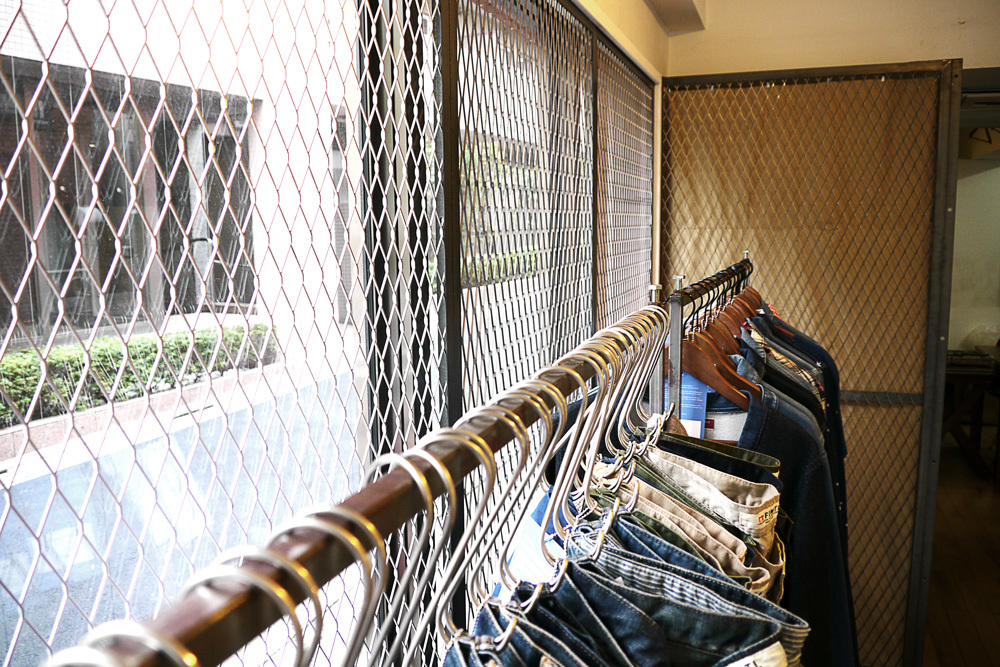 試着室フレーム、窓枠フレームと共通してエキスパンドメタルとLアングルで製作させて頂きました。エキスパンドメタルに洋服などを引っ掛けて展示できるように使用されたいとのことでした。自然に少しずつサビたような感じを育てる?ために塗装をしない黒革仕上げで製作させて頂きました。ただ、エキスパンドメタルは無塗装だと指を切ってしまうくらい鋭利な材料なので気をつけて頂きたいところであります。目黒の家具屋通りにさりげなく現れたロンドンのおしゃれなお店~というような印象を受けました。
