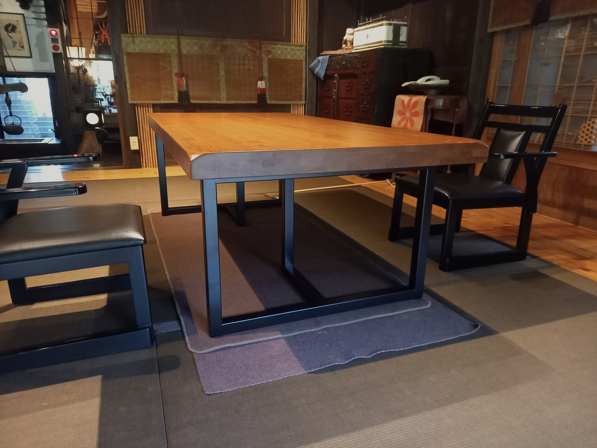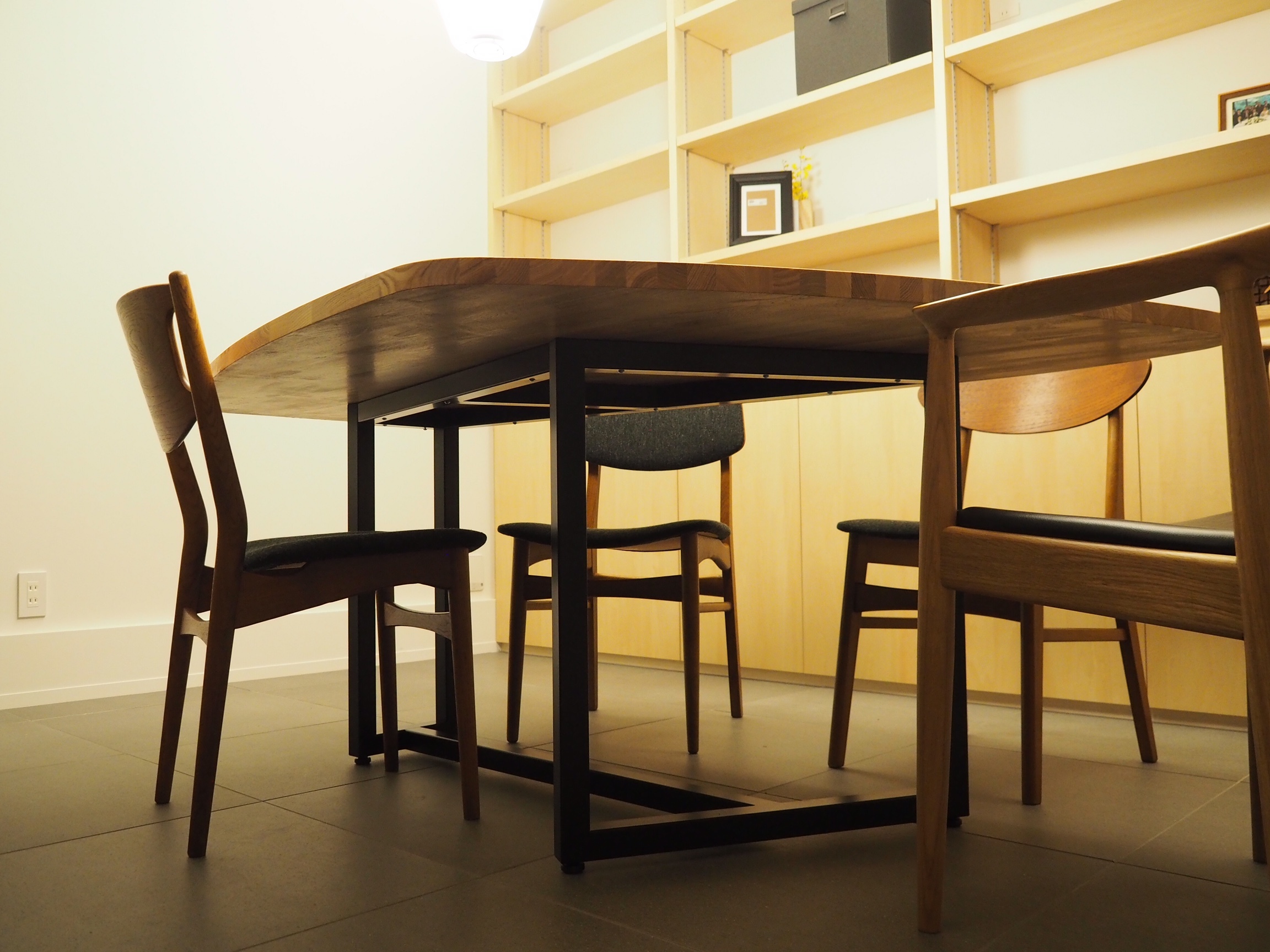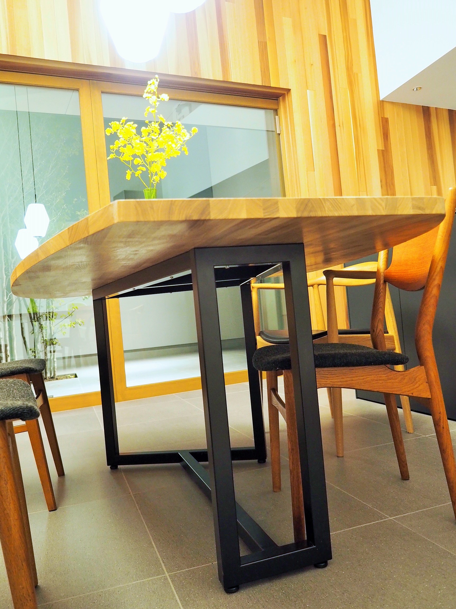 木天板が変形型であってもテーブルフレームは普通の長方形型を作らせて頂くことが多いですが、テーブルフレームも変形型というのはスタイリッシュな印象になるのだなと勉強させて頂きました。