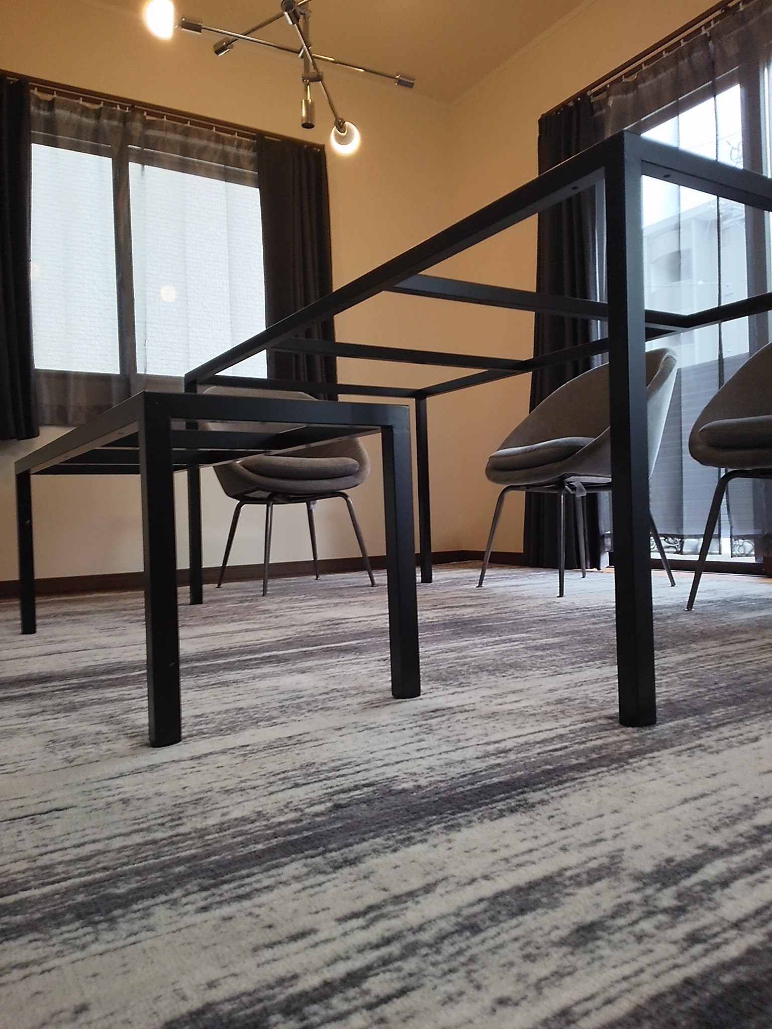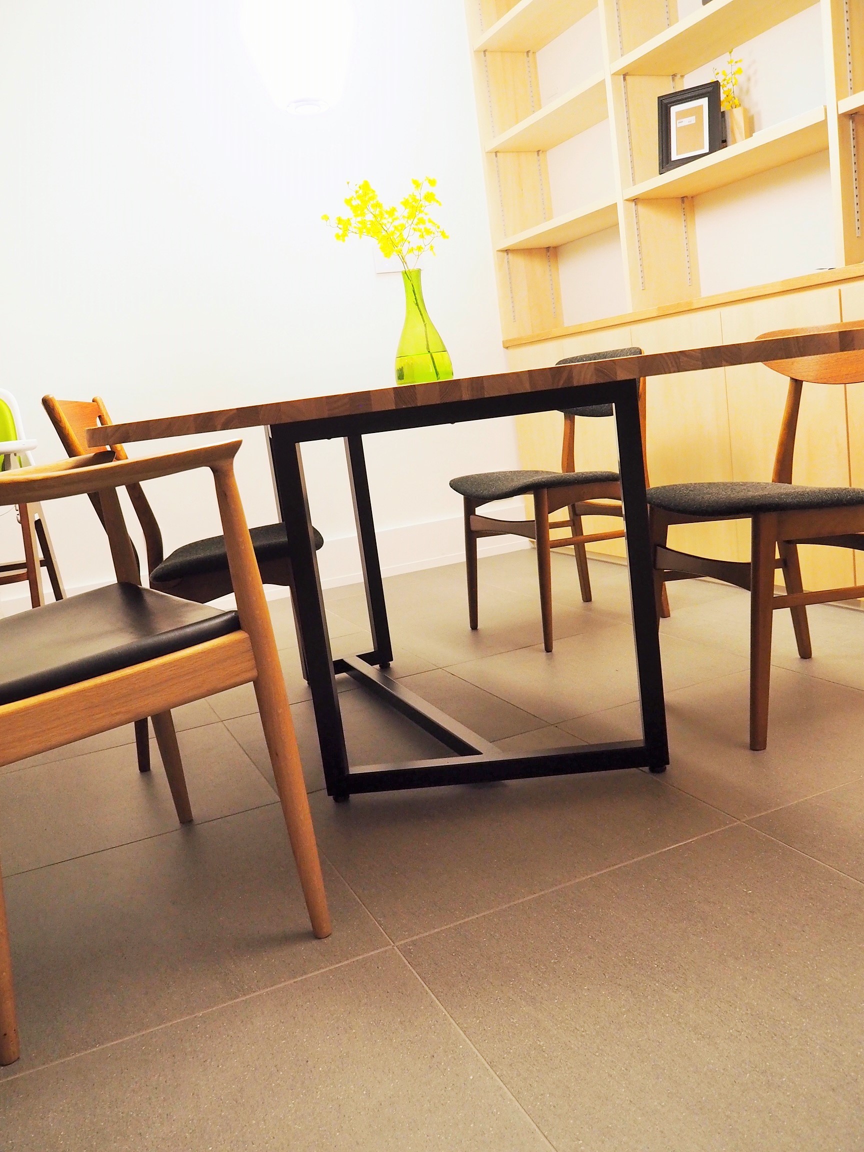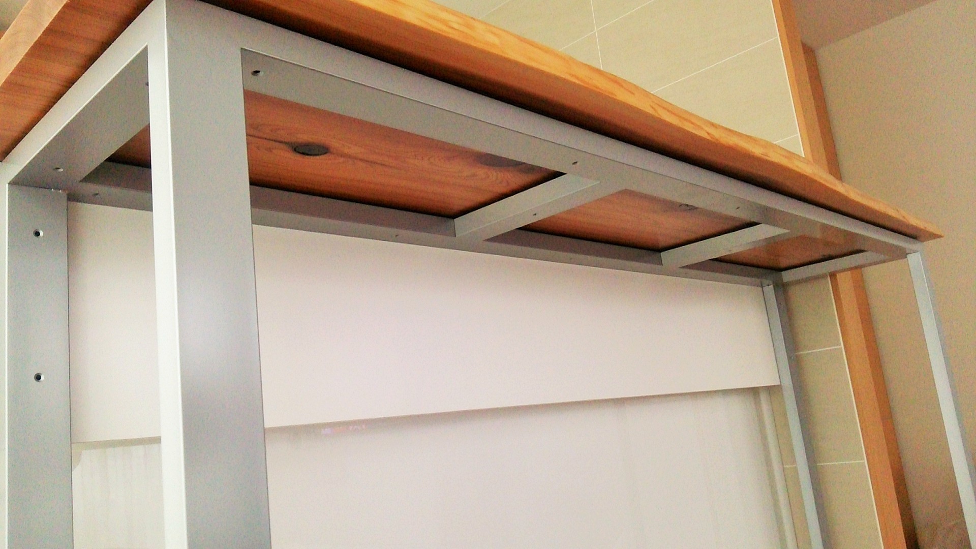 木天板が変形型であってもテーブルフレームは普通の長方形型を作らせて頂くことが多いですが、テーブルフレームも変形型というのはスタイリッシュな印象になるのだなと勉強させて頂きました。