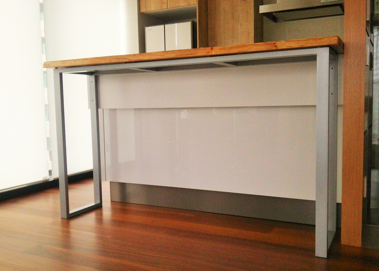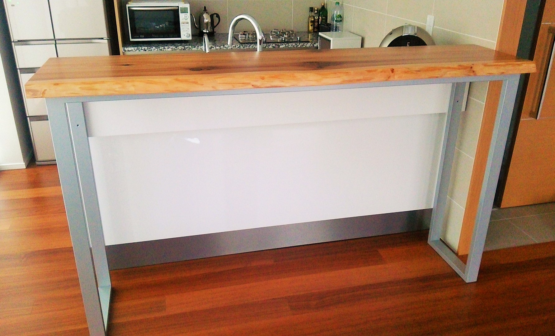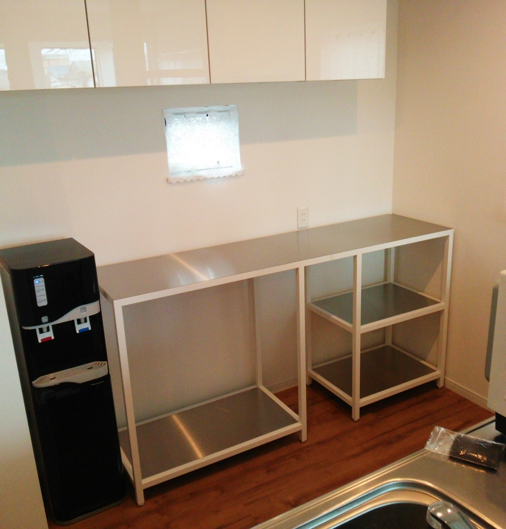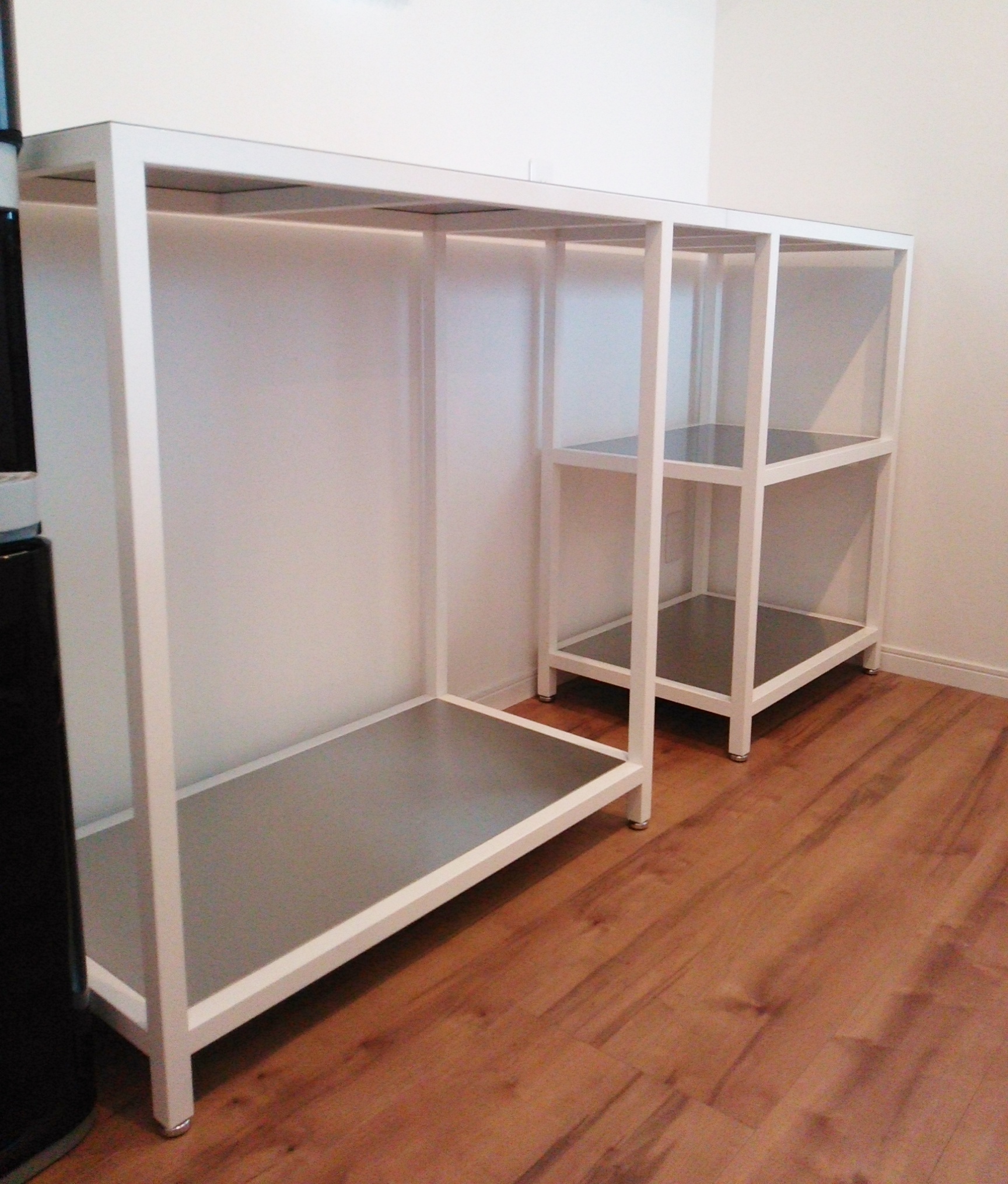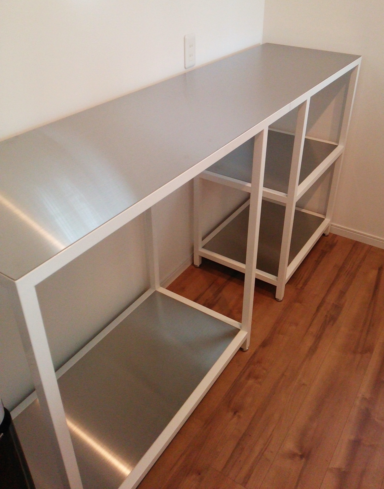 大田区K様からのご依頼で特注の料理台を製作させて頂きました。角パイプフレームは白の粉体焼付塗装仕上げ、そして料理台としてご使用になられるということで、ステンレスの板を天板として用い、清潔でキレイなイメージに仕上がりました。ご自宅入口の搬入ルートの都合で、センター中央部で分かれる2分割式の組み立て式で作らせて頂きました。
