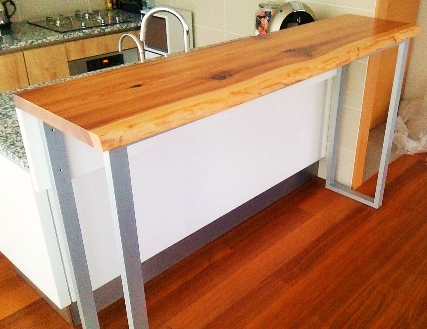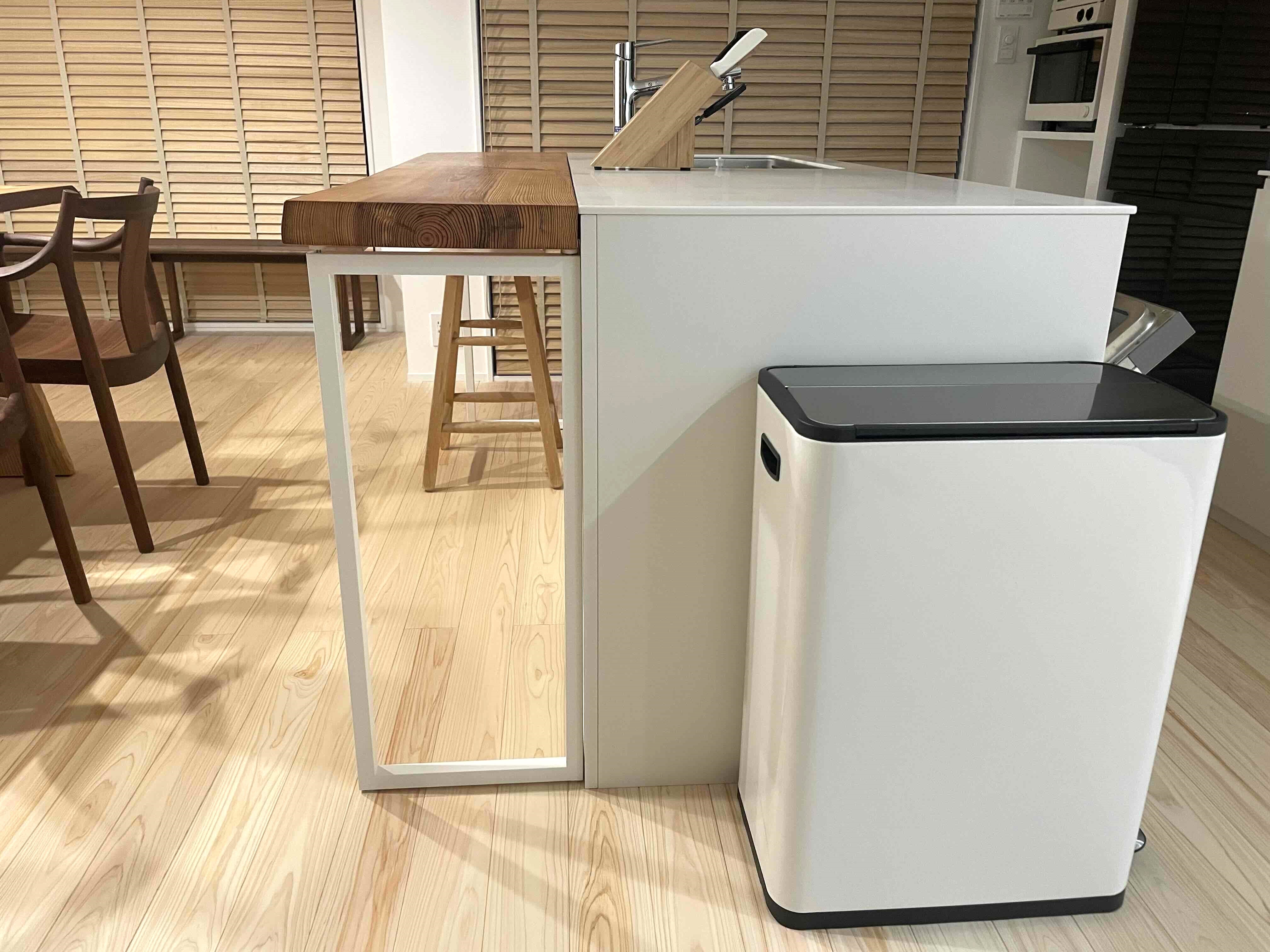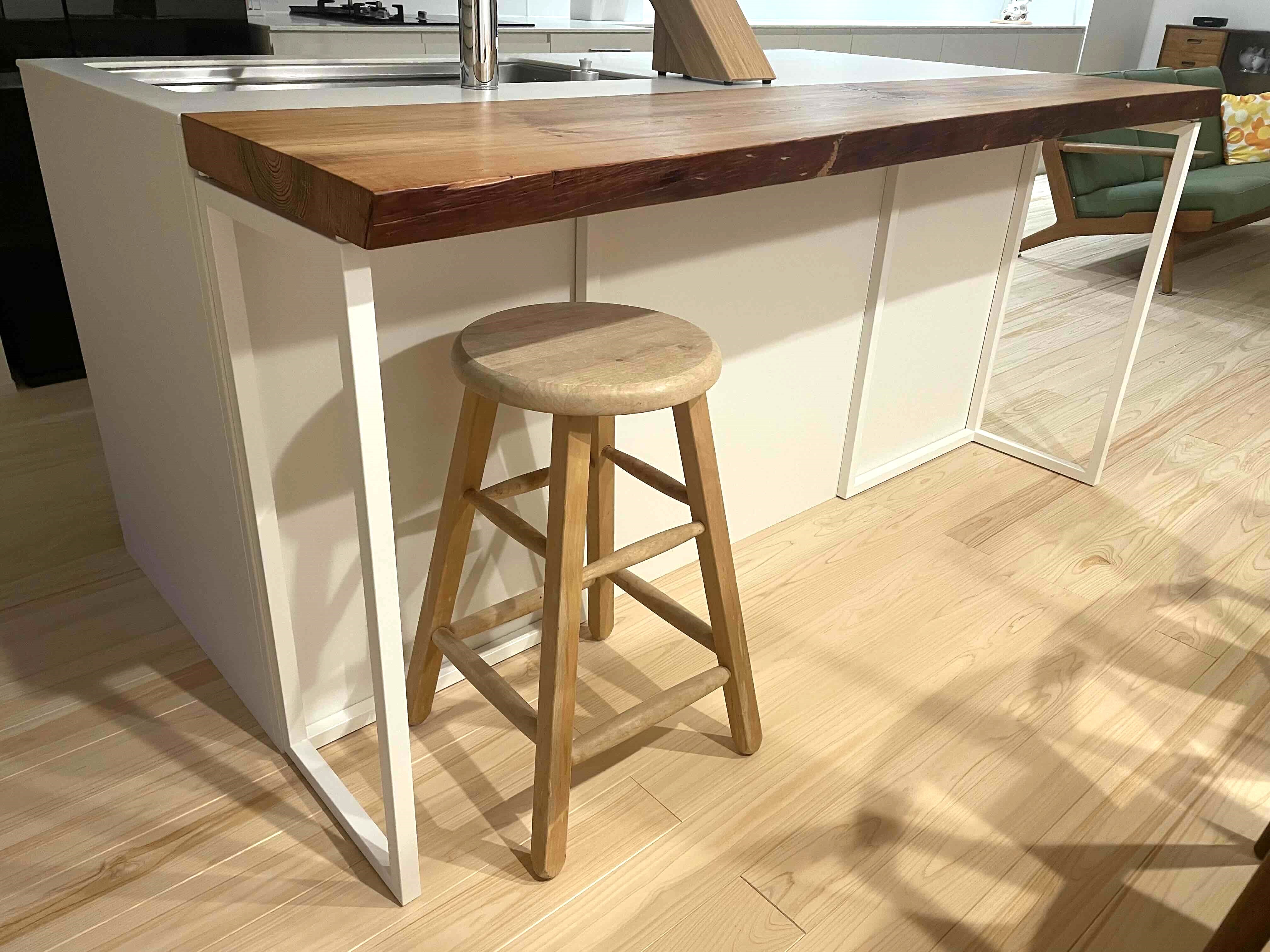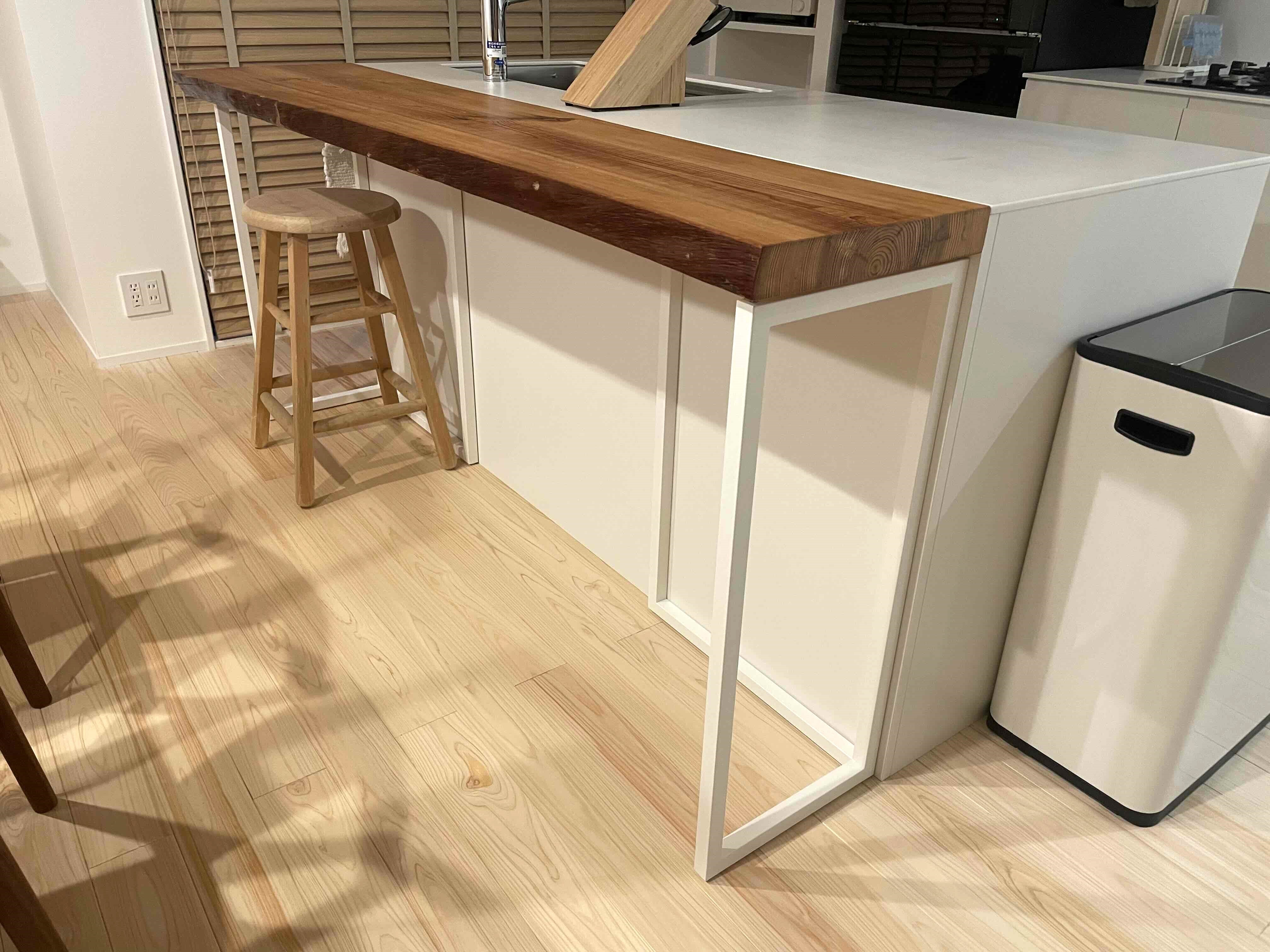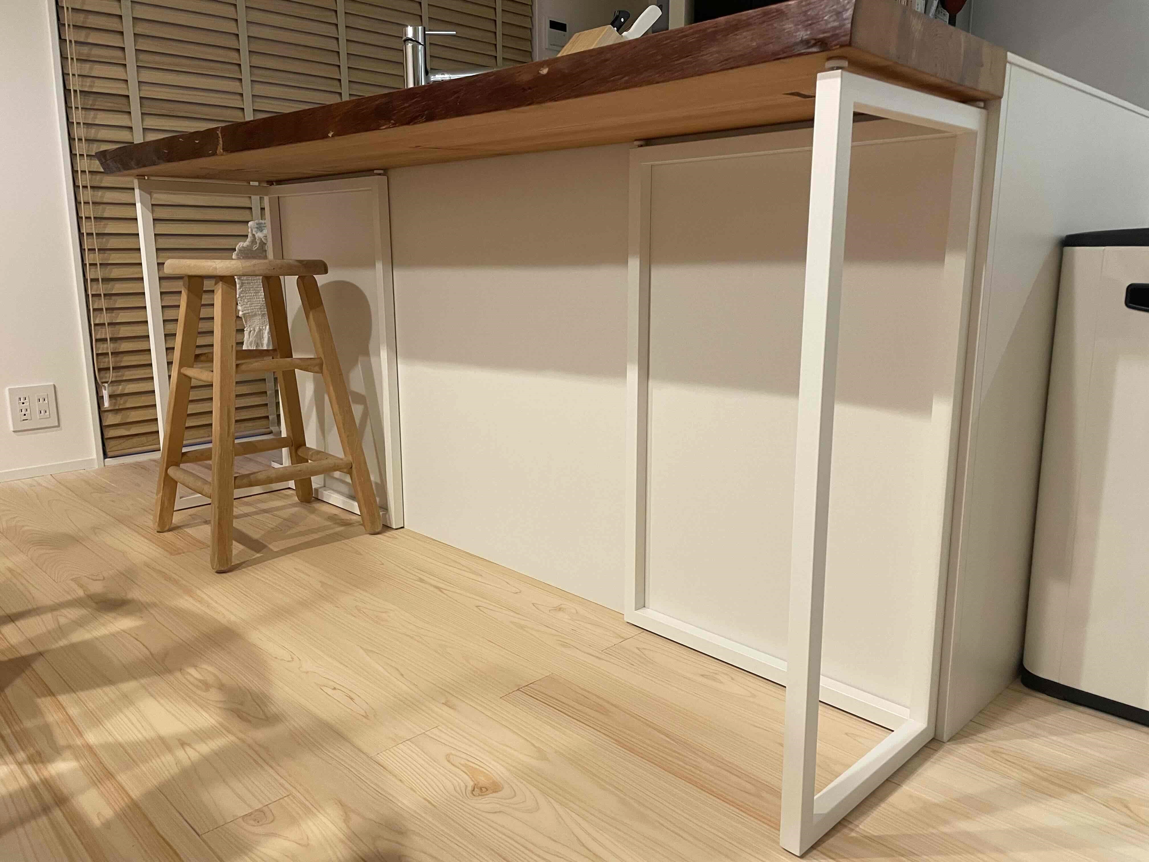 広島県O様からのご依頼でキッチンカウンター脚を製作させて頂きました。ご相談頂いた内容は、DIYで52mm厚(約20kg)の分厚い木板をご自身で鉋(カンナ)がけなさっていたそうですが、平らがなかなか思うようにうまくいかず、底面だけでなく、天板と接する上面にもアジャスターを加工してガタつきを調整できるカウンター脚をお作りになられたいとのことでした。天板は載せるだけなので、アジャスターと天板の間にはズレ防止に耐震ゴムも挟まれたそうです。また、できるだけ軽やかに見せたいとのご要望で、細めの角パイプ25×25(mm)というサイズを採用し、白塗装でスッキリとした仕上がりとなりました。
