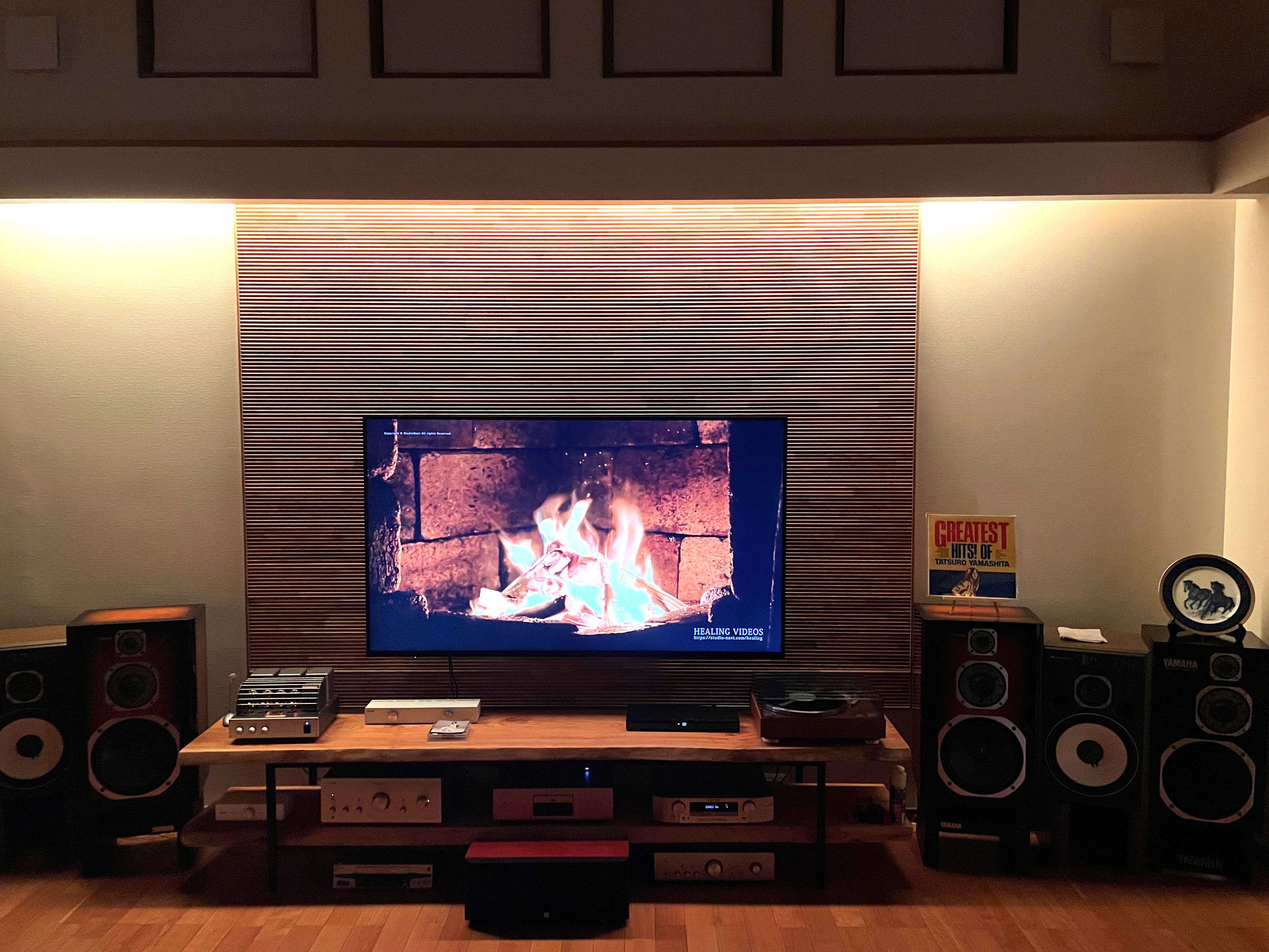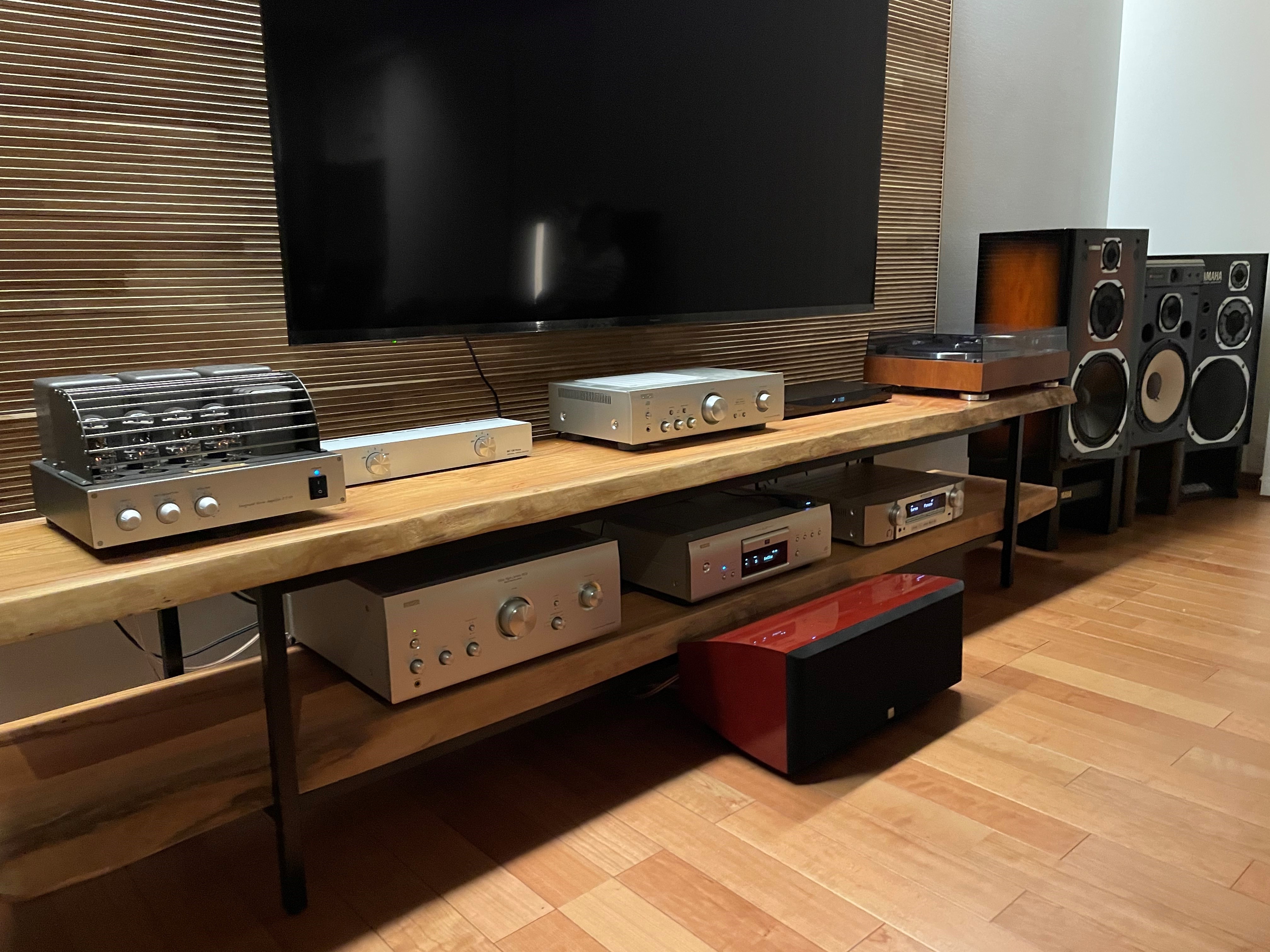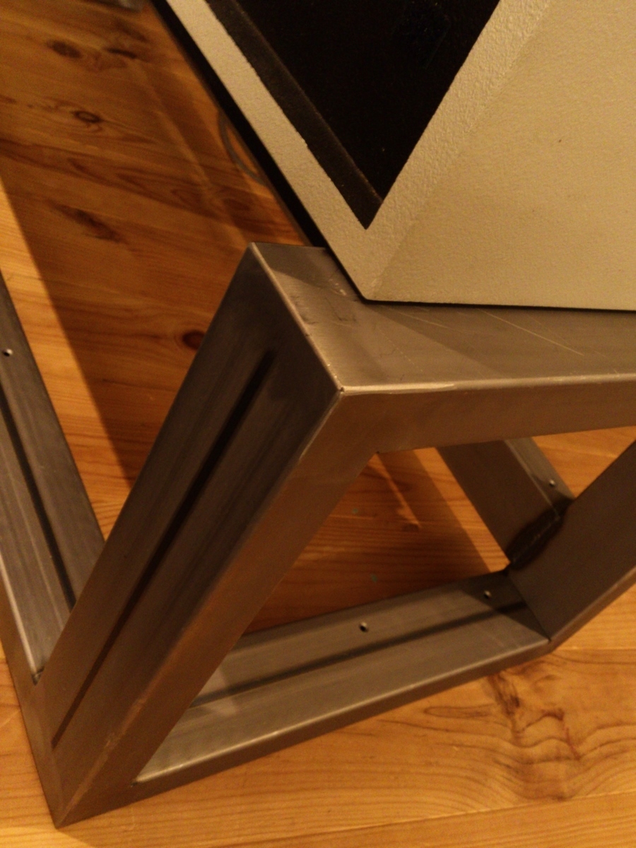 80×40の平角パイプでかなりゴツイ代物です。S様曰く、スピーカーと床の高さを出すことにより、音の聞こえ方が全然違うのだそうです。ちなみに2台製作させて頂いたので部屋の両サイドに設置させて頂き、大迫力な音響ルームでした。