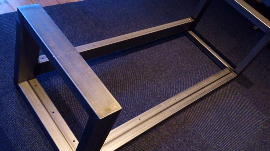 世田谷区K様からのご依頼でテーブルフレームを製作させて頂いたのですが、ありそうでないデザインのテーブル脚なのでご紹介をさせて頂きます。フレームが正面はツラ位置になっているのですが、両サイドは凹んでいるデザインなのです。説明がヘタで恐縮ですが、上面の四角いフレームは40×20(mm)の平角パイプをタテ使いで組み上げ、脚4本は50×26(mm)という材料を用いて両サイド面にだけ接する形で溶接している、というデザインなのです。職人の私としては作り方をどうしても合理的かつ経済的に考えてしまいがちなので、全てを同じ材料サイズで揃えて考えたり、脚4本もツラ位置になるようになどオーソドックスに作らせて頂くケースが多いのですが、ちょこっとのひねりって、オシャレに見えてしまうモノなんですよねぇ…。Tシャツの胸ではなくて袖にワンポイントみたいな、とでも言いましょうか。特注製作ならではのデザインです。