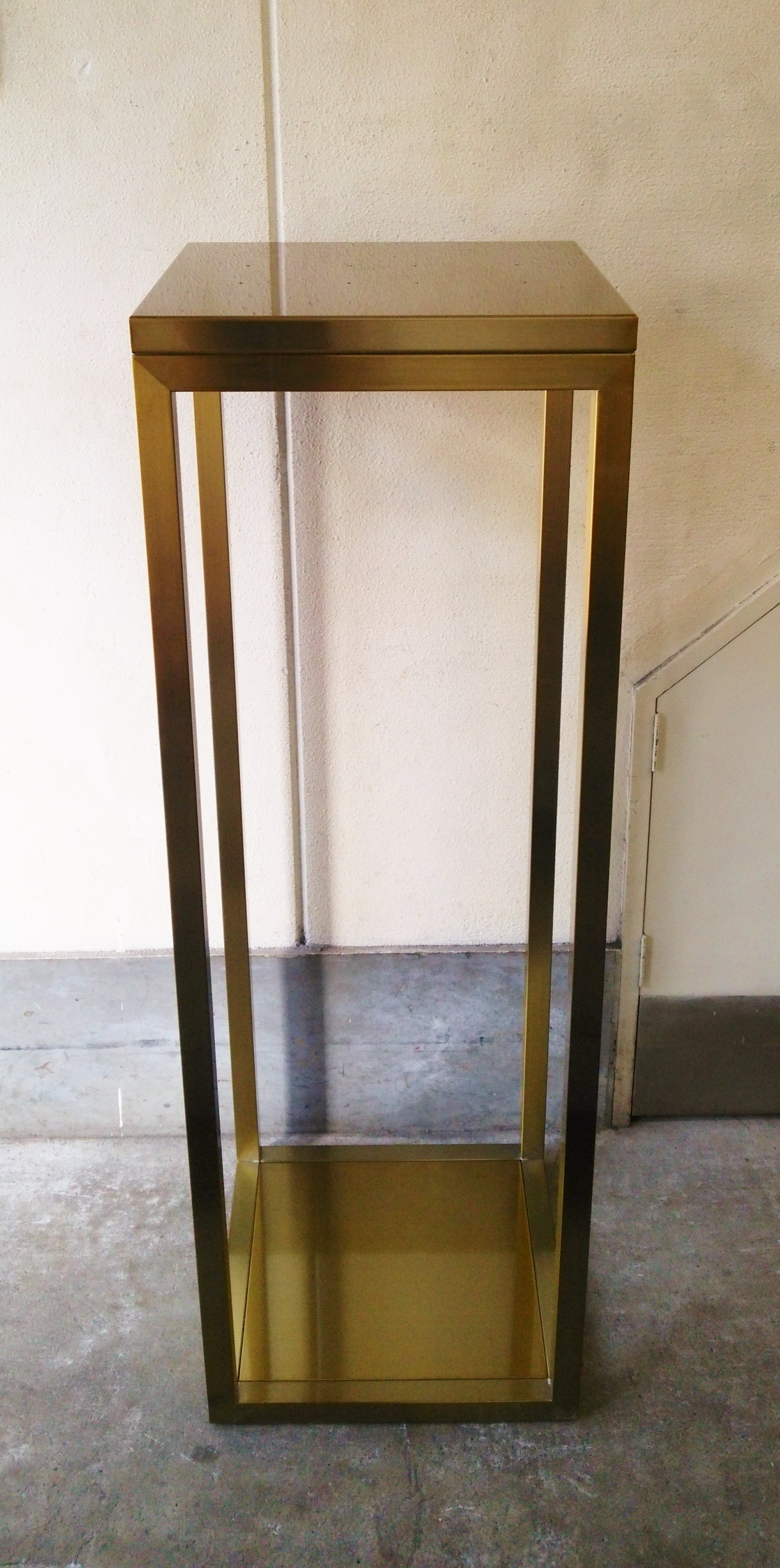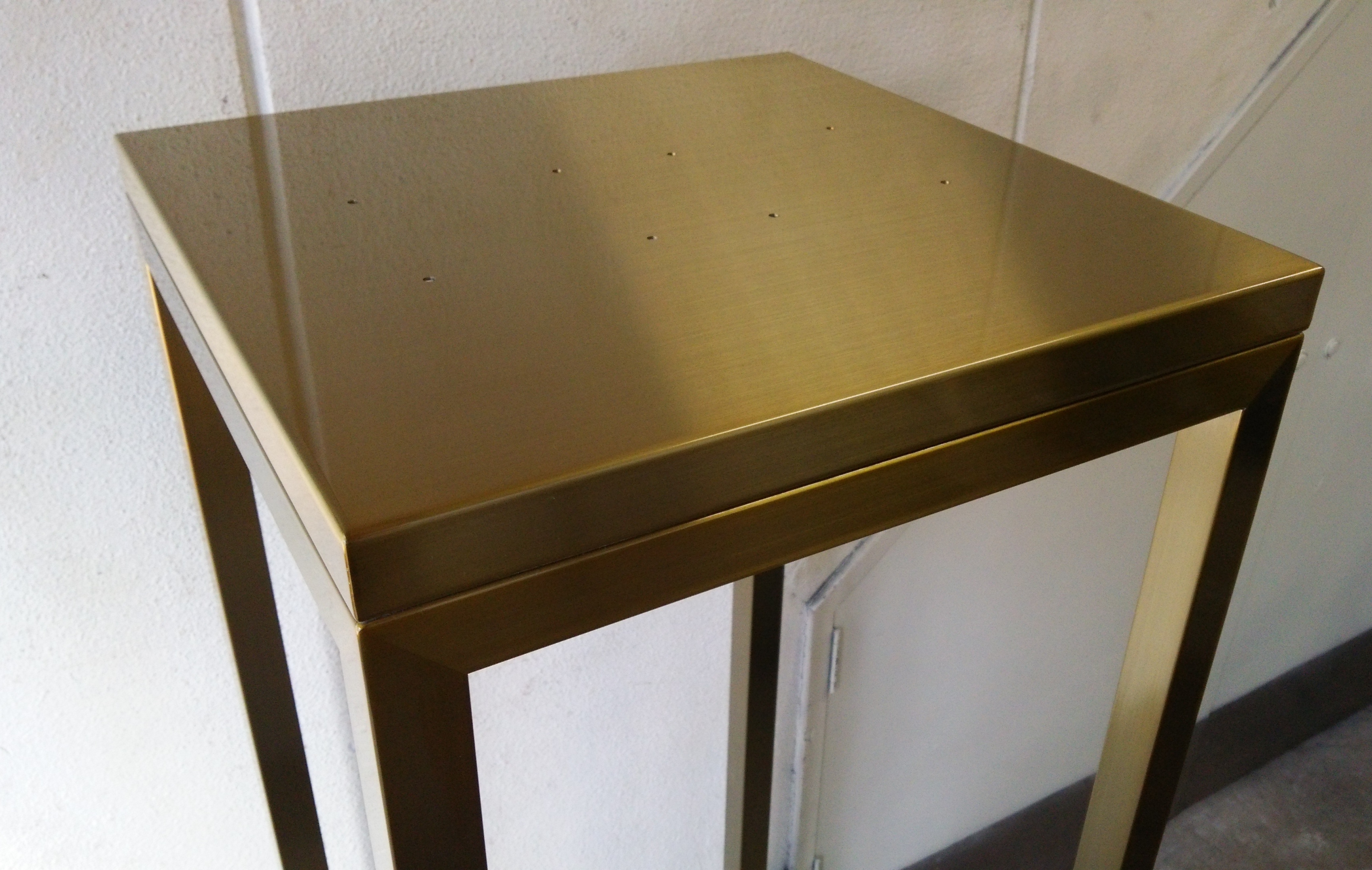 世界的チェーンの某有名企業様から『トロフィーの展示台を真鍮で作ってほしい』というご相談を頂きました。真鍮でこの写真のような展示台は弊社では製作できないため、全てステンレスのヘアライン仕上げで作り上げたあとに、特注の色で焼付塗装を施して真鍮風に仕上げました。上面部には穴をあけて下からトロフィーをビス固定して倒れないようにしました。