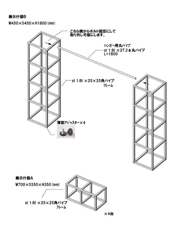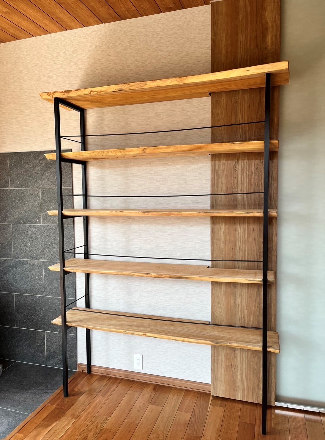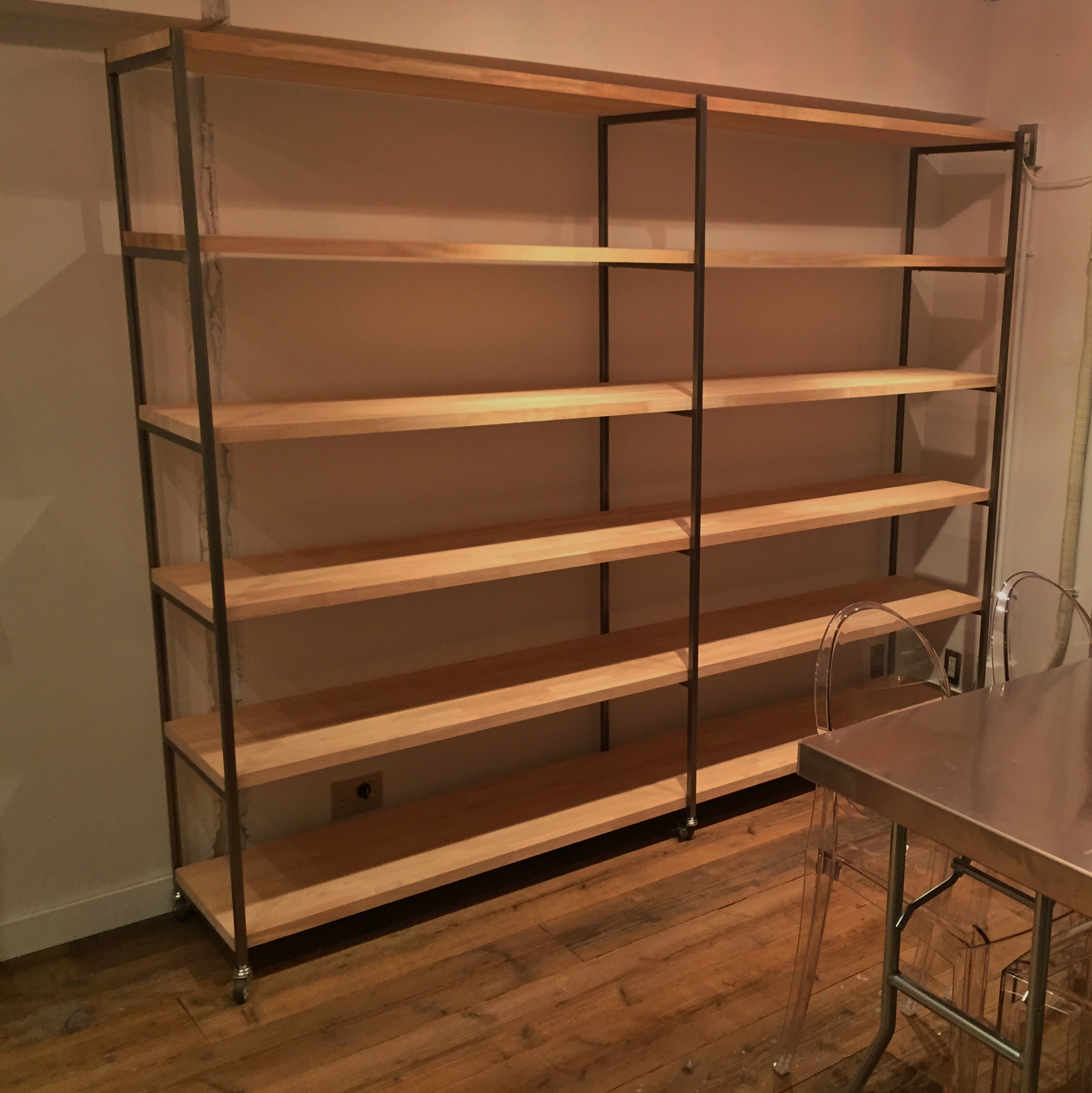 グラインダーの跡や角パイプのつなぎ目もあえて見せる作りで、インダストリアル感たっぷりな什器となりました。