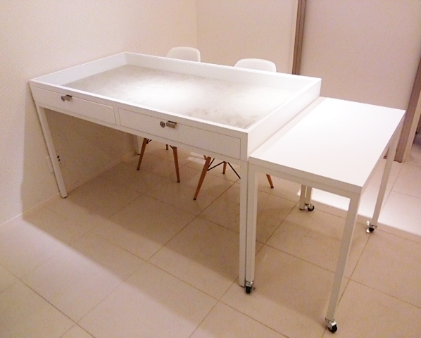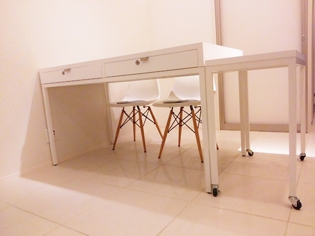 打ち合わせもできるショーケーステーブルとネイル用ワゴンテーブル