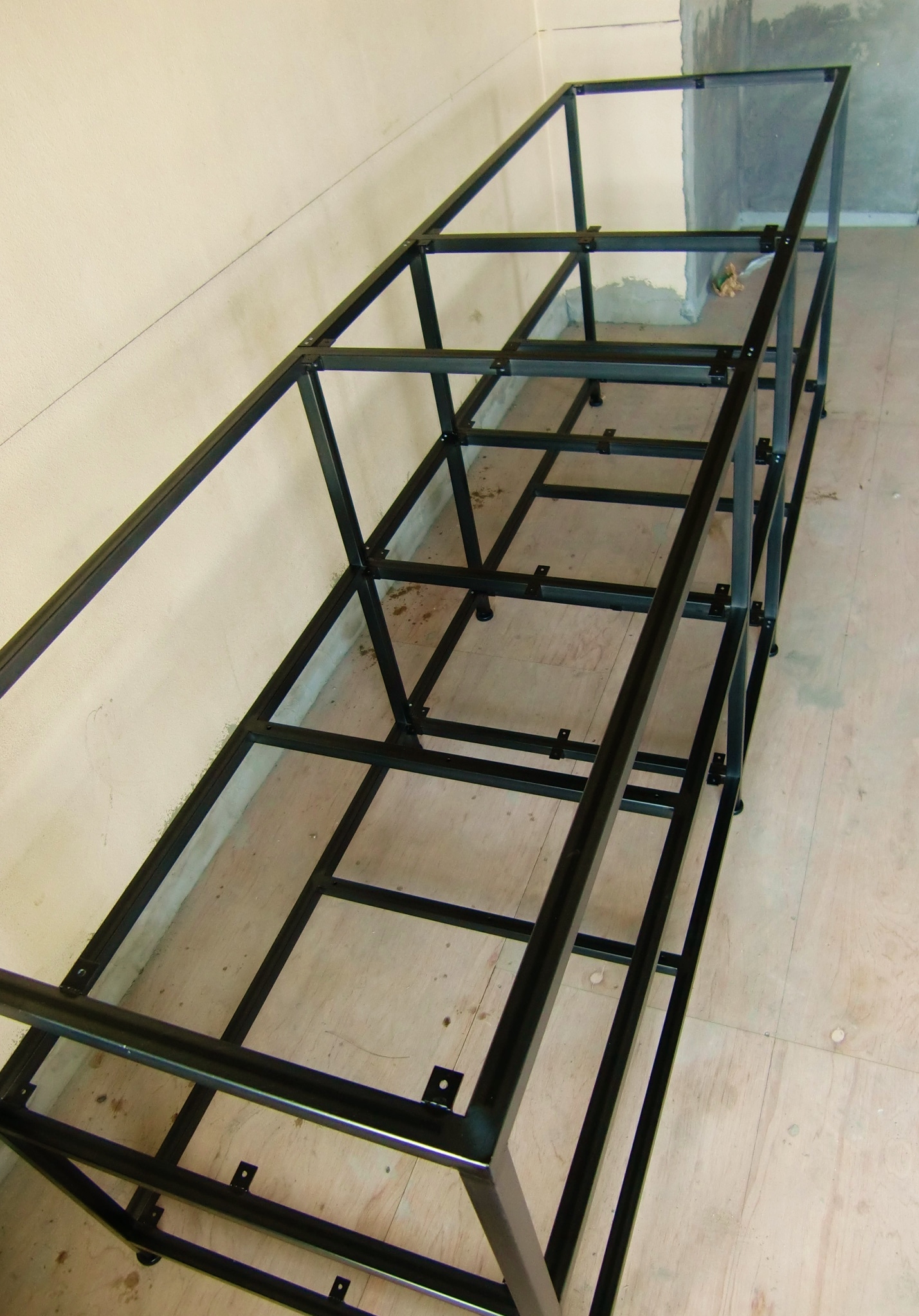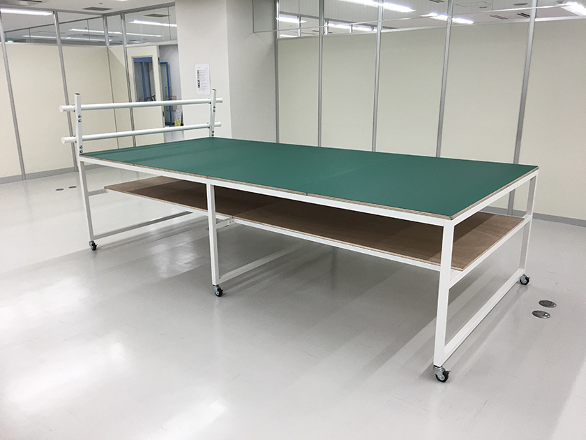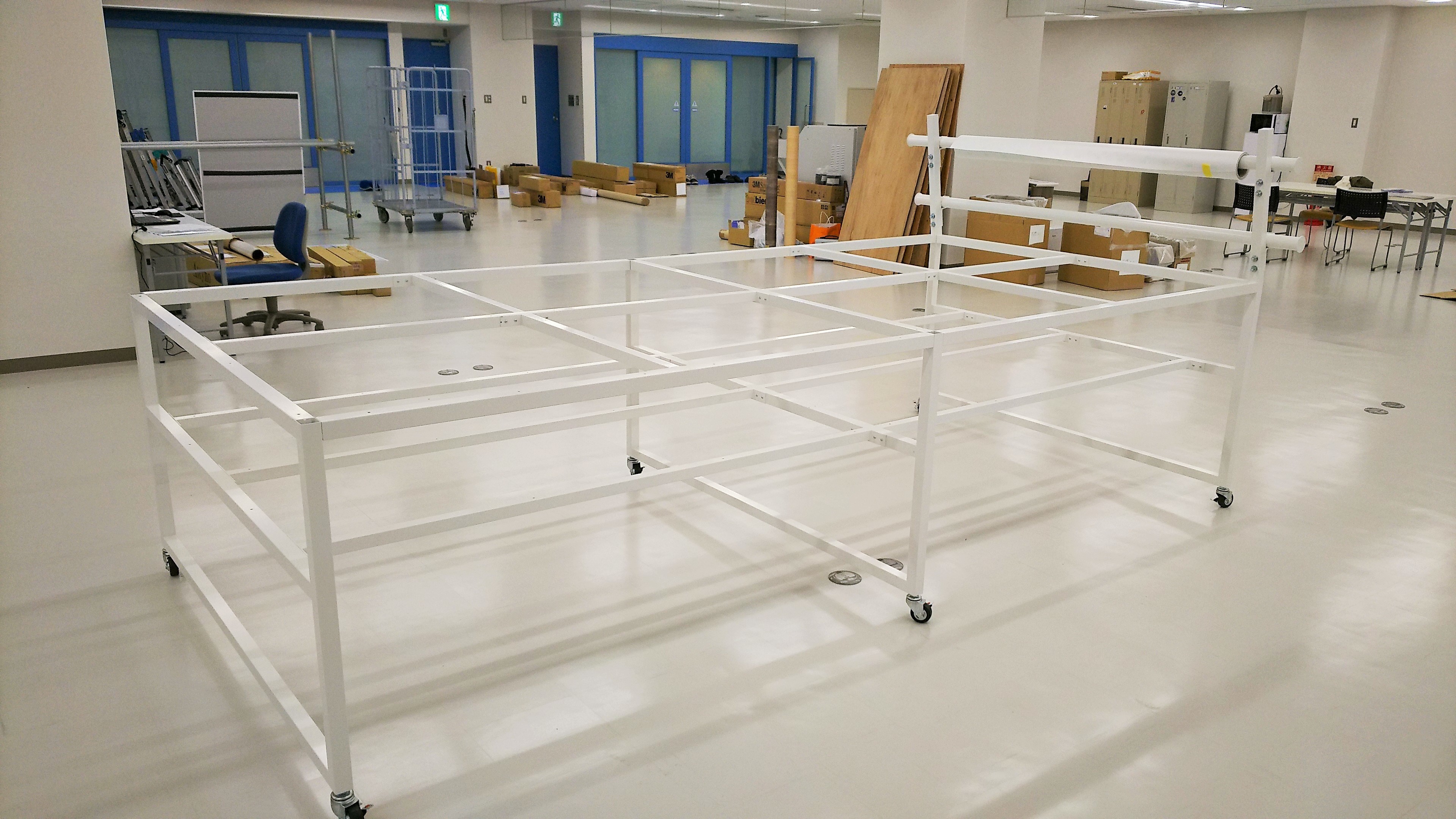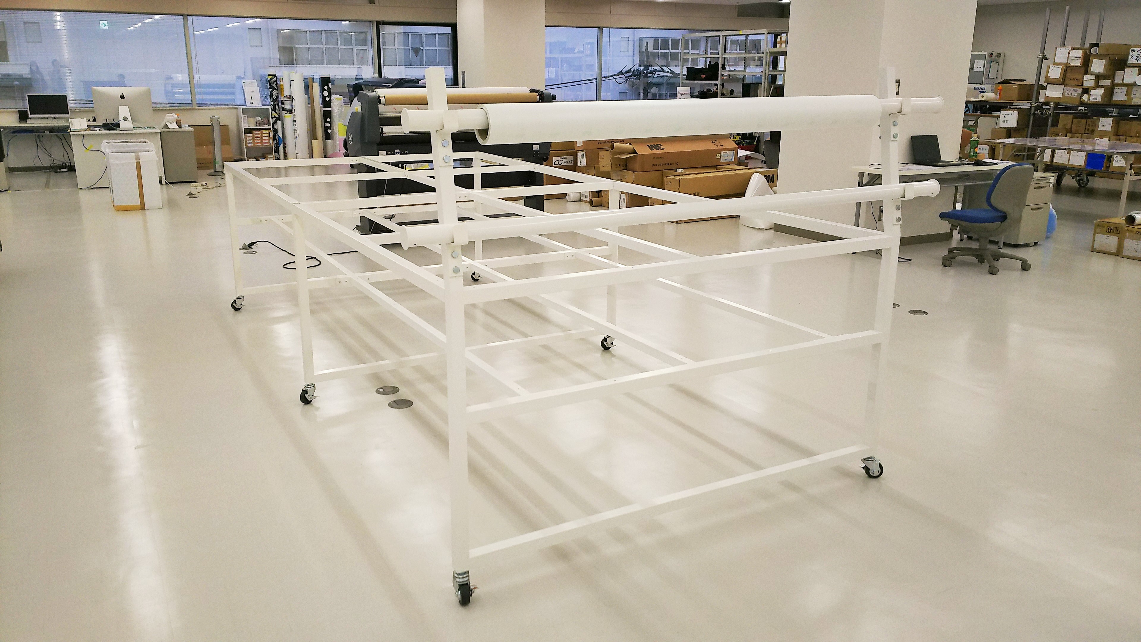 都内・某印刷会社様のご依頼で、ロール状の塩ビシートやフィルムなどを裁断するための作業台フレームを製作させて頂きました。サイズはW3500×D1650×H900(mm)の特大サイズ。そして200φ程度のロールシートをくるくると引っ張れるように、芯となる丸パイプを取り外し式に装着できる仕様にさせて頂きました。メインフレームは38×38角パイプで、天板を受ける内側の補強パイプは32×32角パイプで組み上げております。とても大きな作業台のため、もちろん組立式のアイアンフレームです。