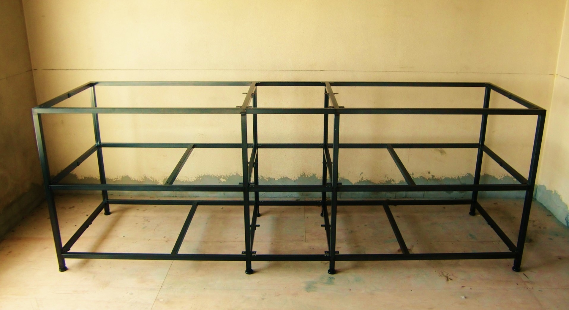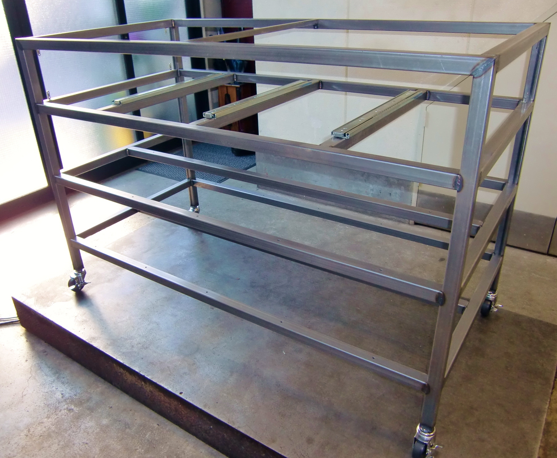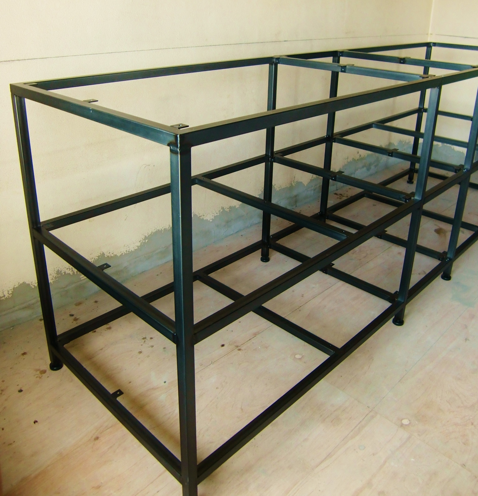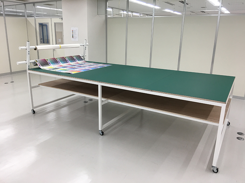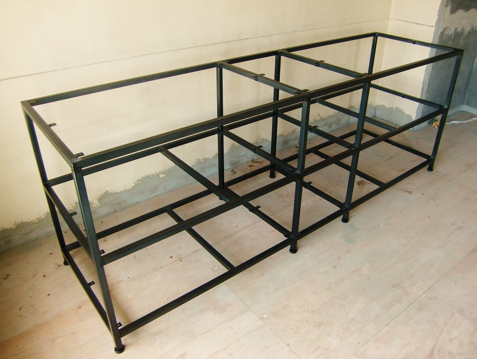 都内・某印刷会社様のご依頼で、ロール状の塩ビシートやフィルムなどを裁断するための作業台フレームを製作させて頂きました。サイズはW3500×D1650×H900(mm)の特大サイズ。そして200φ程度のロールシートをくるくると引っ張れるように、芯となる丸パイプを取り外し式に装着できる仕様にさせて頂きました。メインフレームは38×38角パイプで、天板を受ける内側の補強パイプは32×32角パイプで組み上げております。とても大きな作業台のため、もちろん組立式のアイアンフレームです。