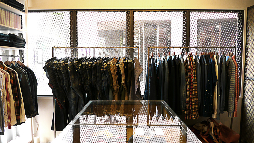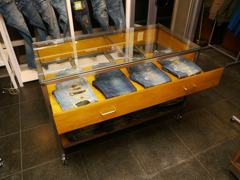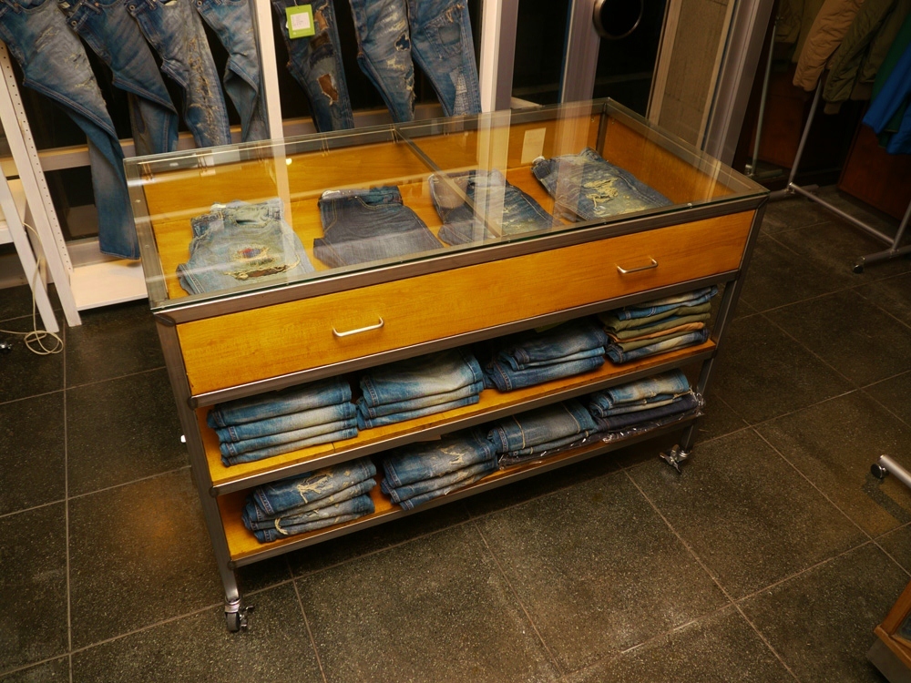 アパレルブランドFundamental Agreement LUXURYを展開されているフリークワークス様のSHOP『Catii』のご依頼により、ジーンズを展示するためのショーケースフレームを製作させて頂きました。