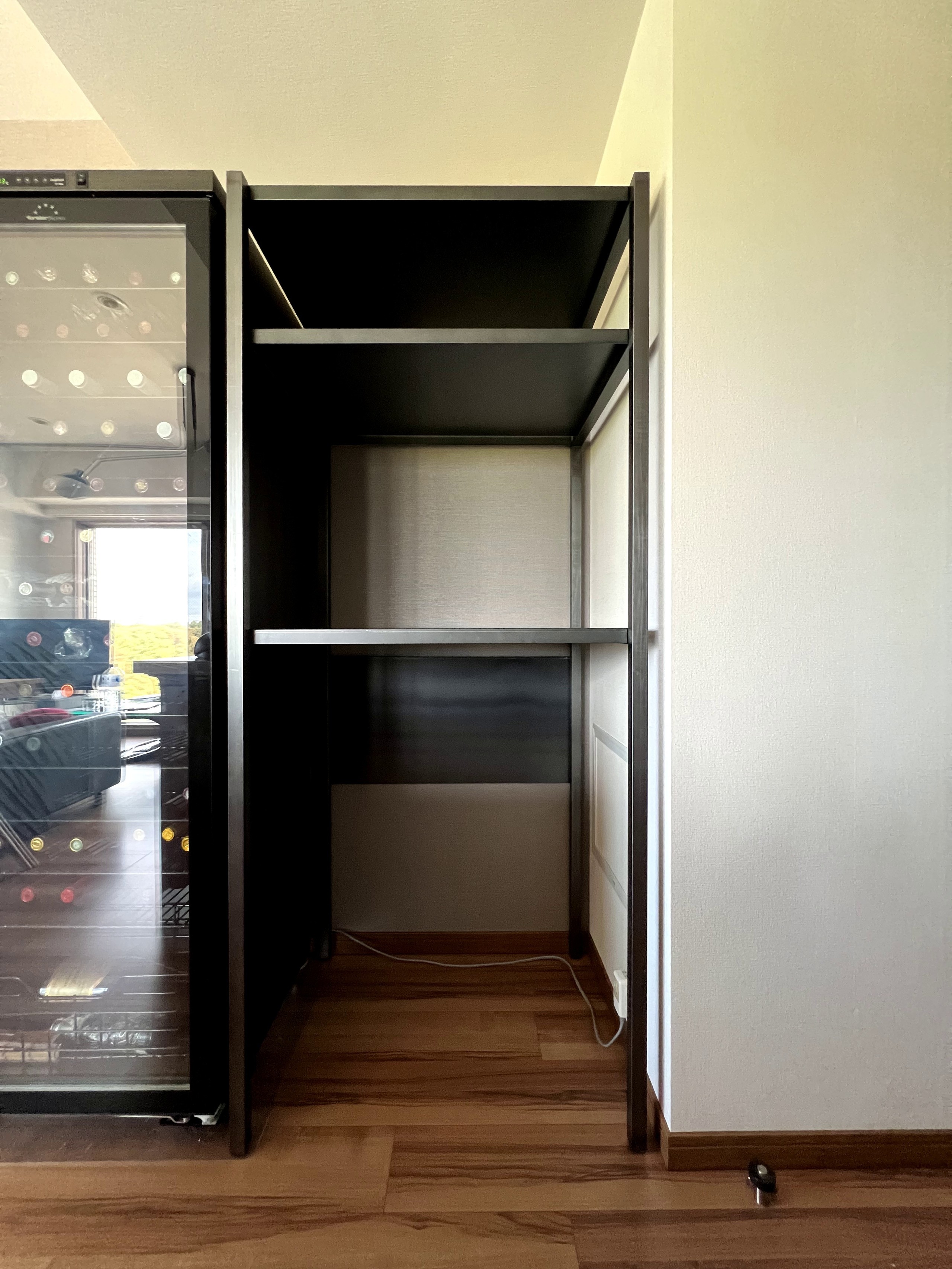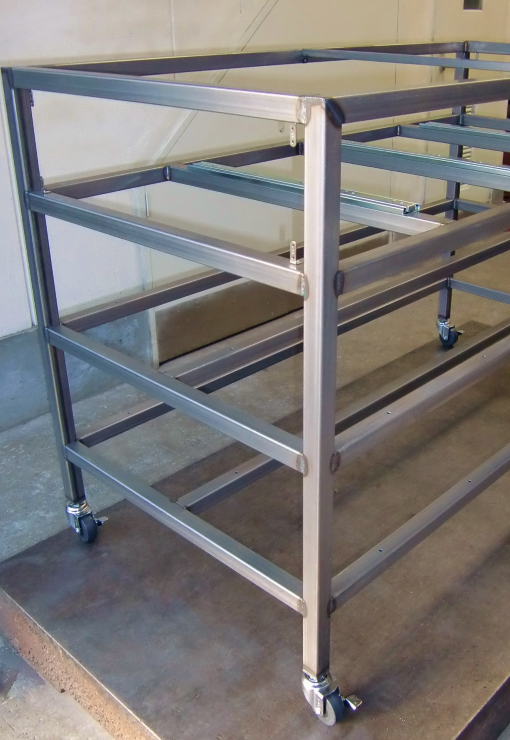 ステンレスのヘアライン仕上げでも十分高級感はありますが、さらに焼付塗装を施すという贅沢な仕上げなのでかなりコストはかかりました。しかし、とにかく高級感を出したいという方には非常にオススメの仕上げです。底面には転倒防止のため重い鉄板ベースとアジャスターが隠されております。かなり難易度の高いお仕事の依頼でした。