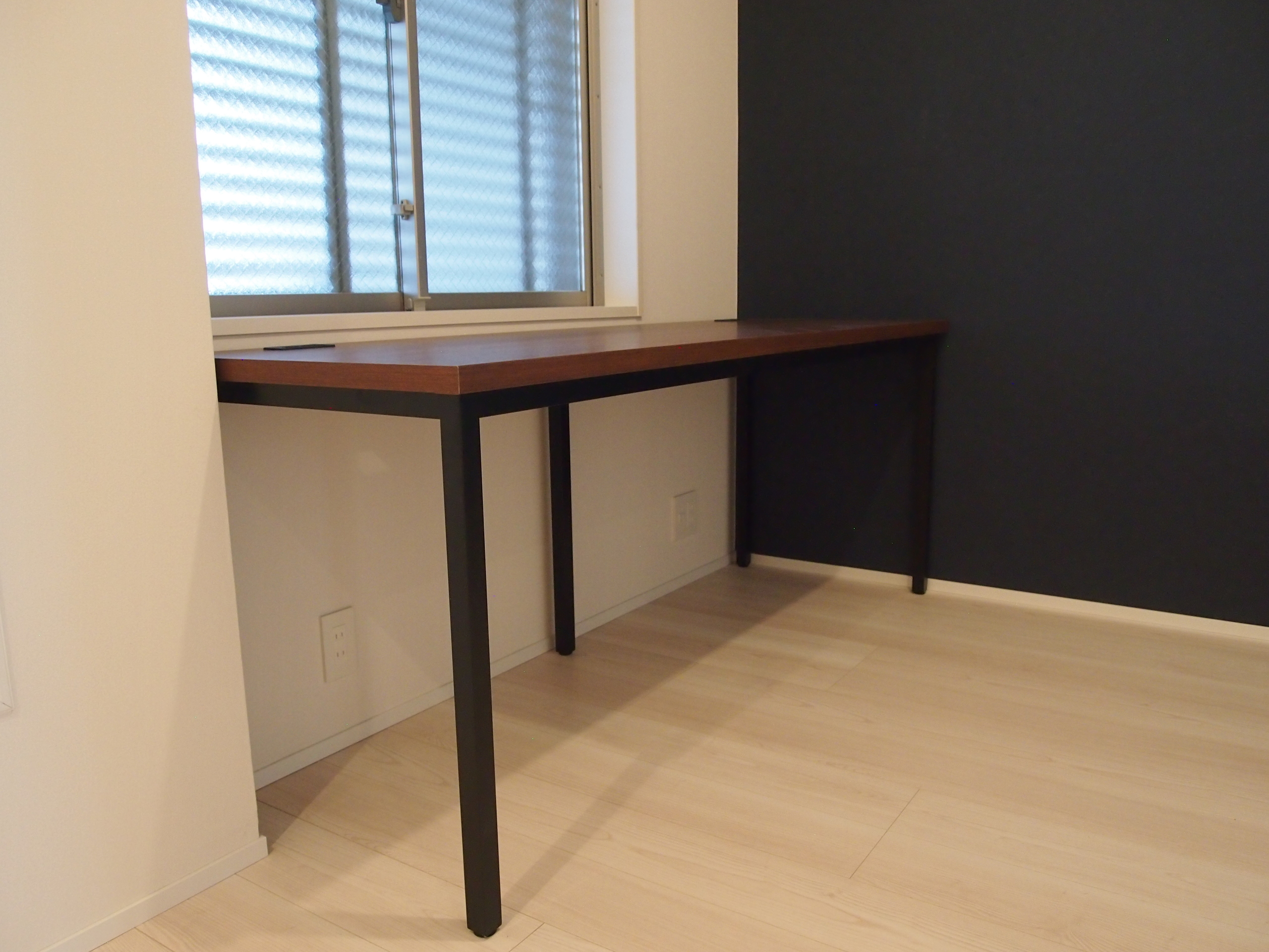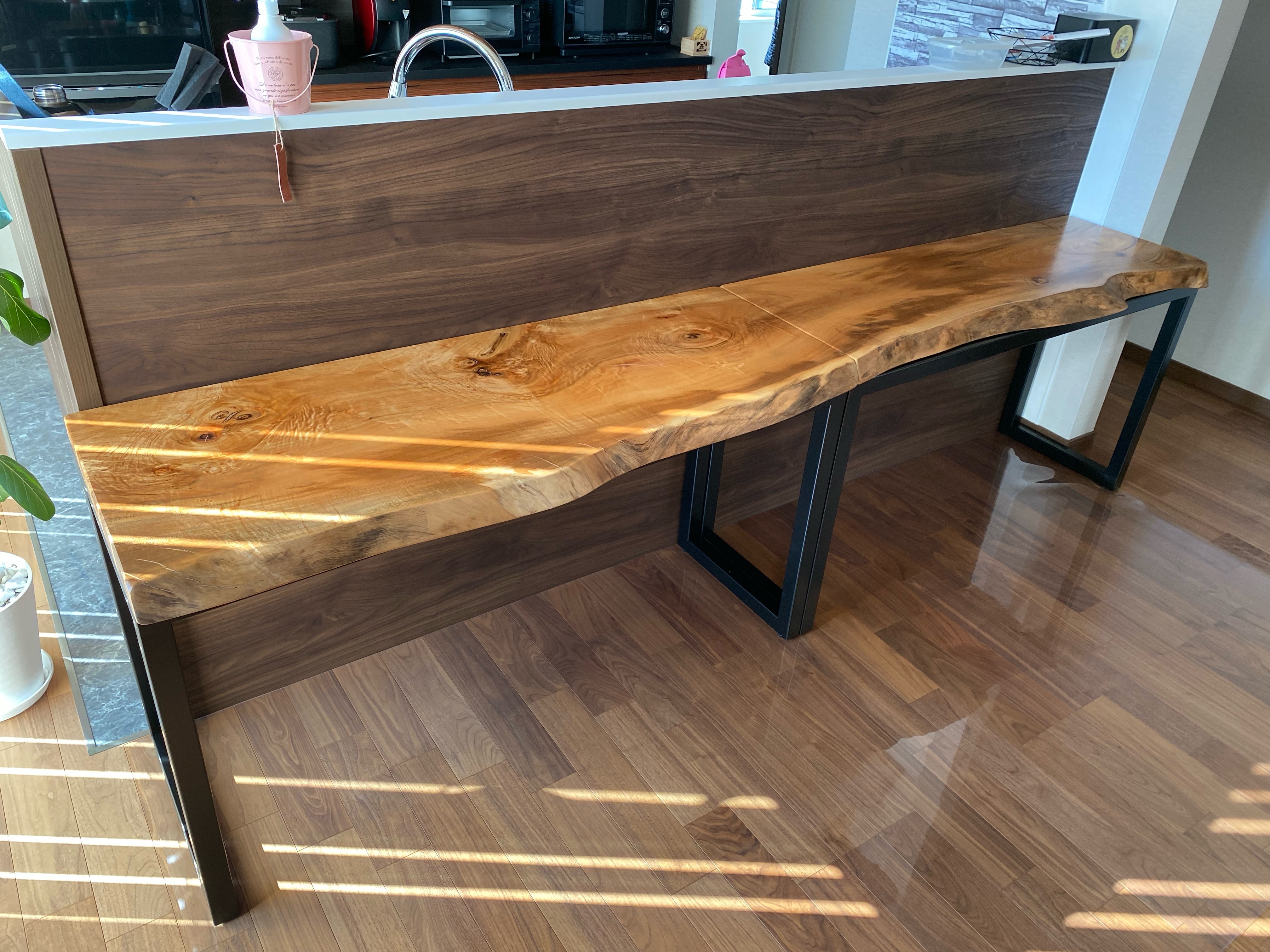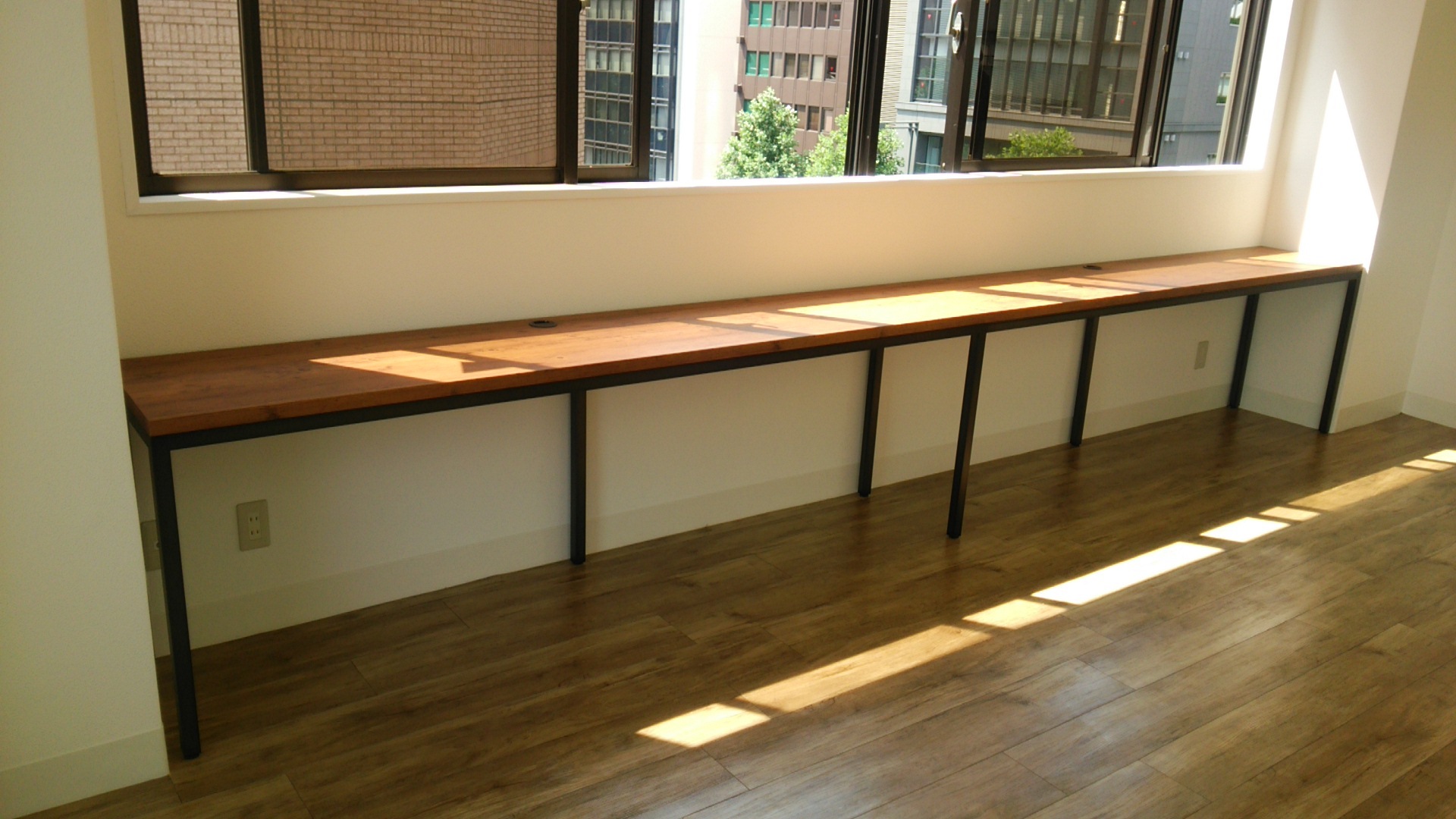 天板はワイド2400mmの一枚板を3つのフレームで支えております。19×19角パイプを用いてクリヤーの焼付け塗装で仕上げさせて頂きました。無機質なクリヤー仕上げと木材の組み合わせがクールな印象を抱かせてくれます。