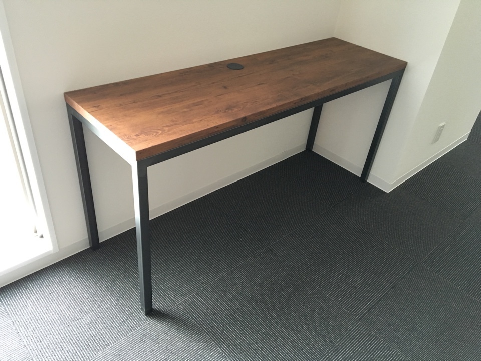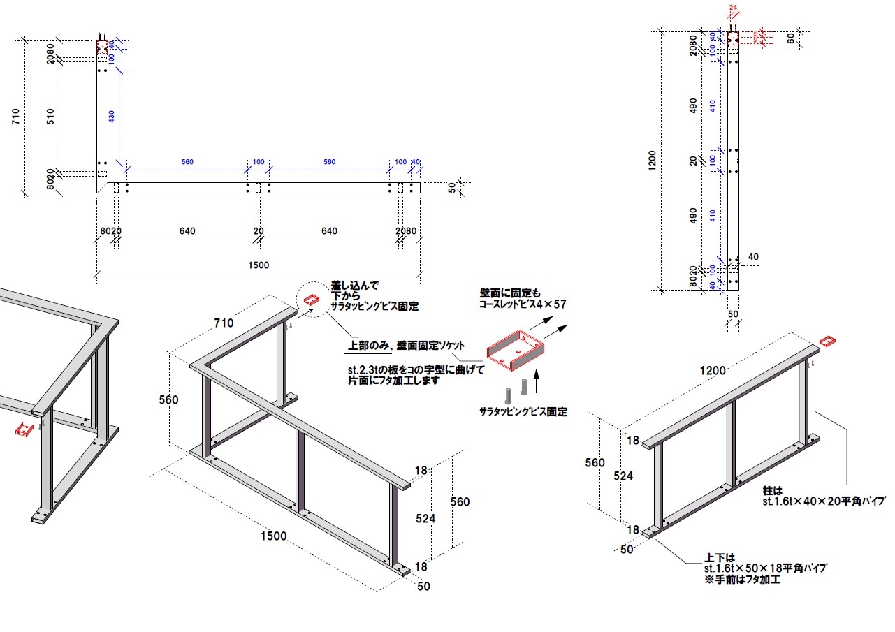 さて本題ですが、平角パイプを用いた珍しいデザインの手すりです。参考までにその時の図面も貼らせて頂きます。壁の中に入り込んでいるかのように見せるため、ソケットになるパーツを先に壁面固定し、手すりとなるヨコ柱を差し込むような固定方法を採用いたしました。細身の平角パイプを黒塗装したことでスタイリッシュな印象。また、壁ドン設置のデスクフレームも製作させて頂きましたが、背面側の脚は3本。つまり5本脚のテーブルフレームです。奥行きが短くてヨコ幅の長いデスクの場合、PCやモニターなどの重量にかなり耐えることのできる5本脚デスクもいいですね。市販品では見ないですよ、5本脚デスクなんて。テーブルトップには人気のアイカ天板にPCケーブルを通すことができる穴加工を施したようです。リノベーション会社さんハンドリングだと細やかな点もご提案頂けるのかもしれません。ご興味ある方はご相談なさってみてはいかがでしょうか?