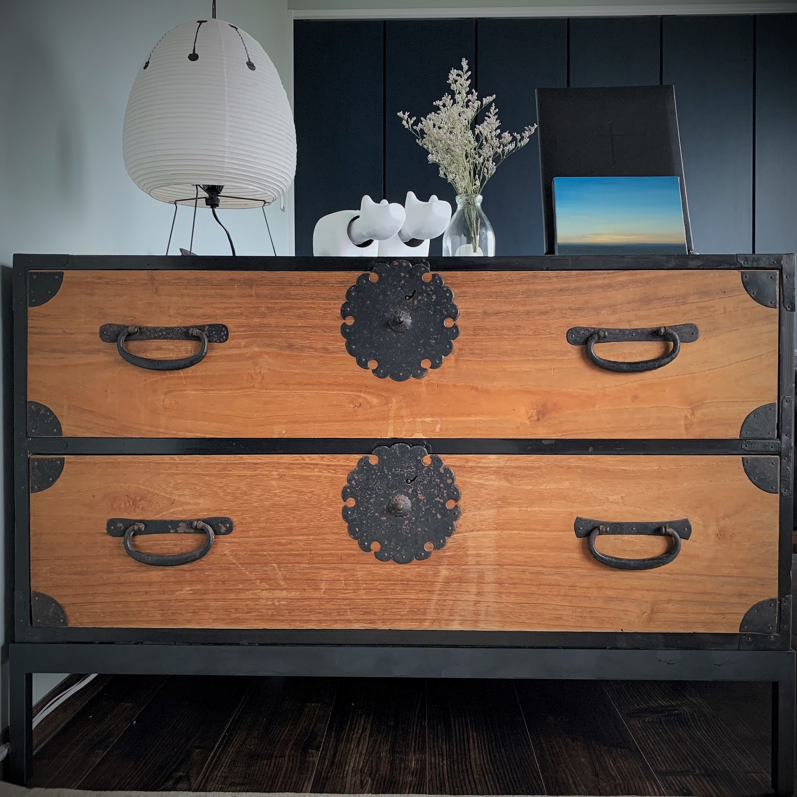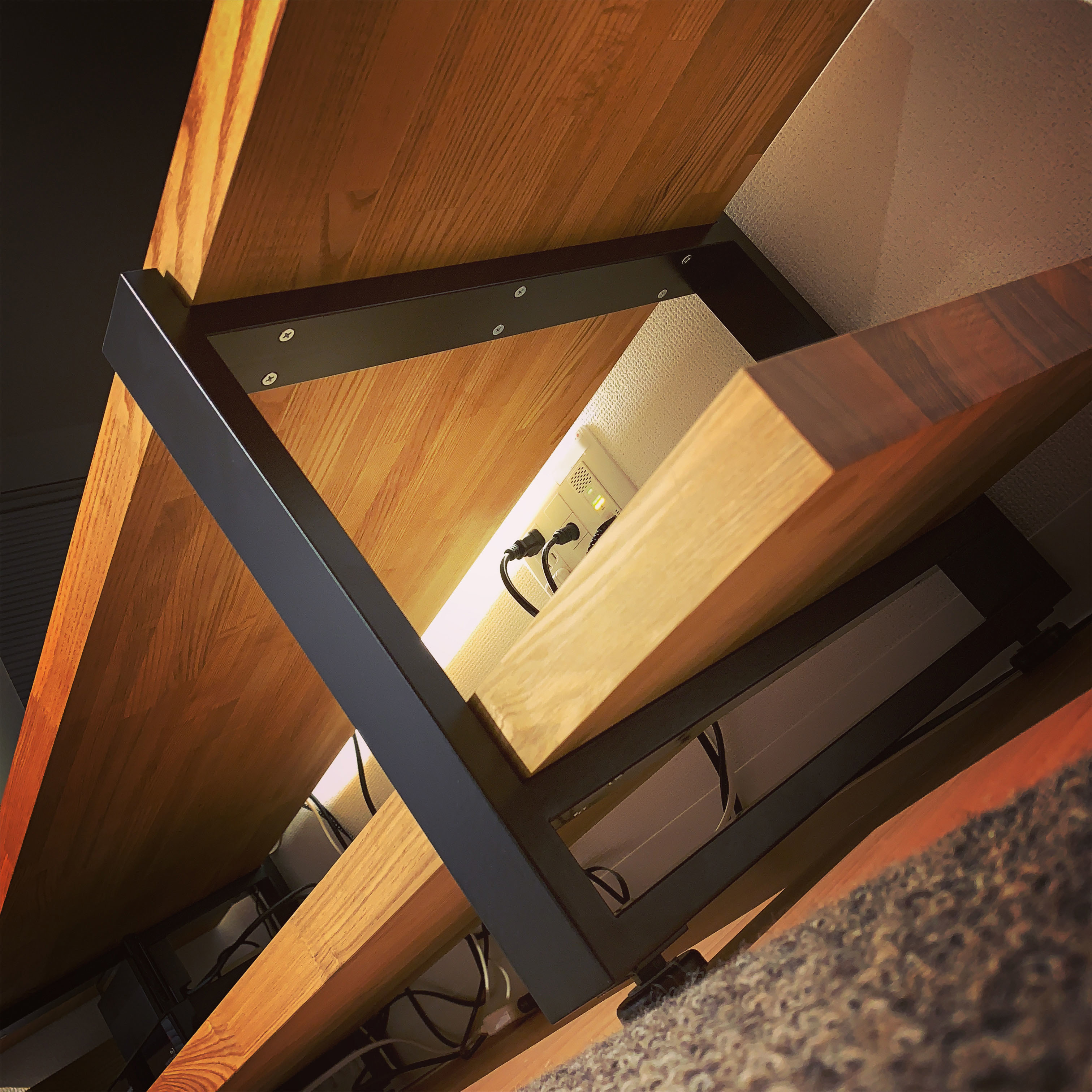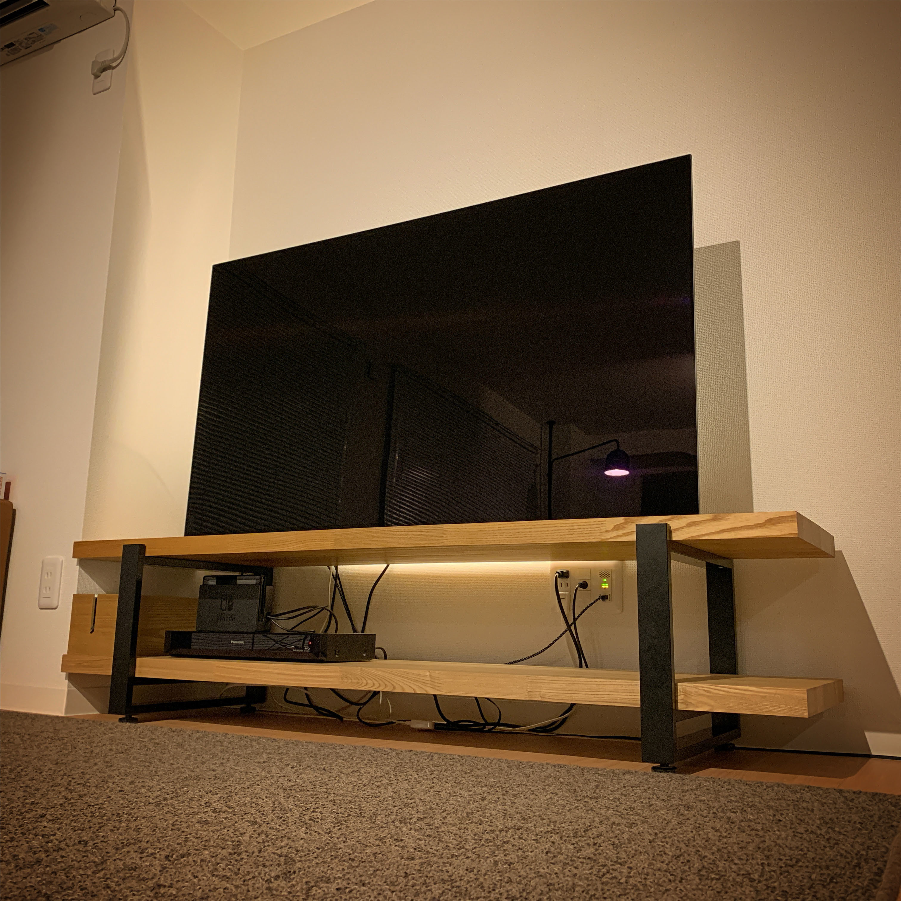 札幌市S様からのご依頼で、テレビ台用のアイアン脚を製作させて頂きました。お使いになられる木天板サイズ(S様のご手配)はタモ集成材・t=40×W1600×D410(mm)、重量は約18kg/1枚を上下段で2枚使用。テレビとアンプを載せたいとのことで50~60kgに木材が耐えられるかどうかを心配いたしましたが、問題なくお使いになられているとのことでよかったです。耐荷重用の重量アジャスターも使っているので安心です。私は木材に関しましては素人のため詳しくないのですが、無垢材よりかは集成材の方が経年や湿度状況の反りは少ないらしいので、もし似たようなTV台をお作りになられたいという方は購入前にホームセンターや木材屋さんに聞いてみてください。用途を伝えれば的確に教えてくれると思います。