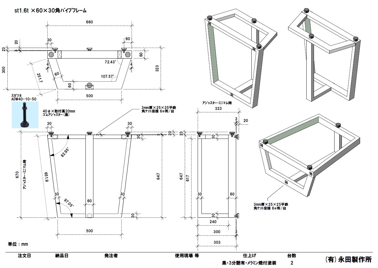 この種類のアイアン脚オーダーについて、よくフラットバー(平鉄)で作ってほしいと相談を頂くことがありますが、私個人的な意見では頼りなくて安っぽくなるので好きではありません。グニャグニャしやすい弱点もあります。なのでこちらのS様のケースのように50×18という平ぺったい角パイプをオススメいたします。安定感もよく、アジャスターも加工しやすいのでメリットがよいのであります。平角パイプの中では最もシャープな印象で高級感を感じるフォルムなので私、好きですコレ。