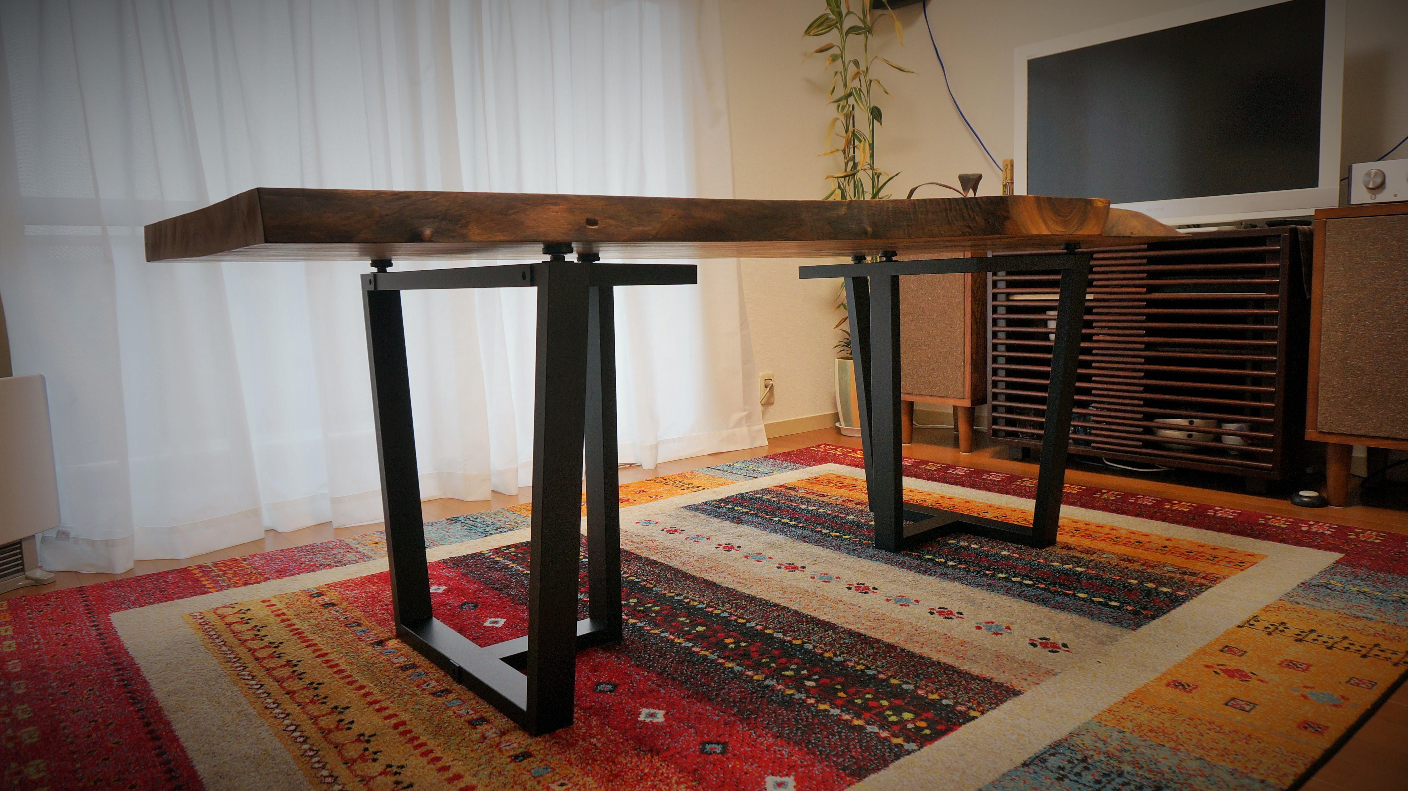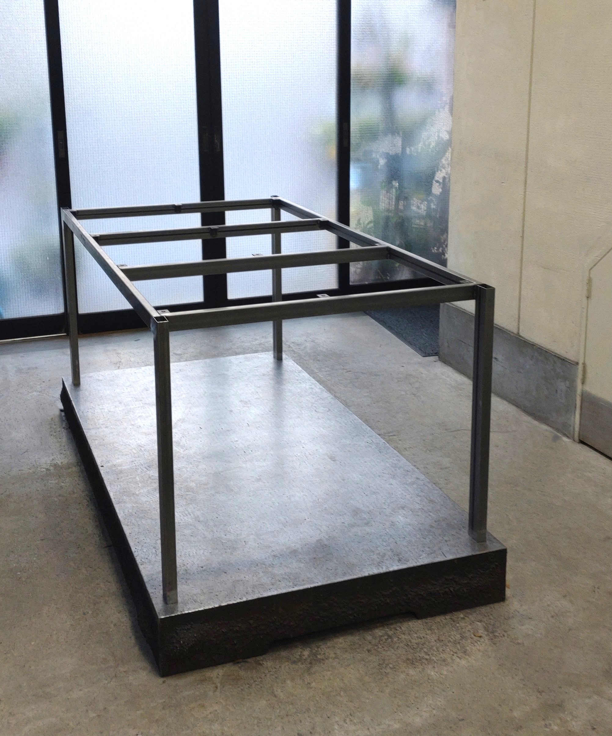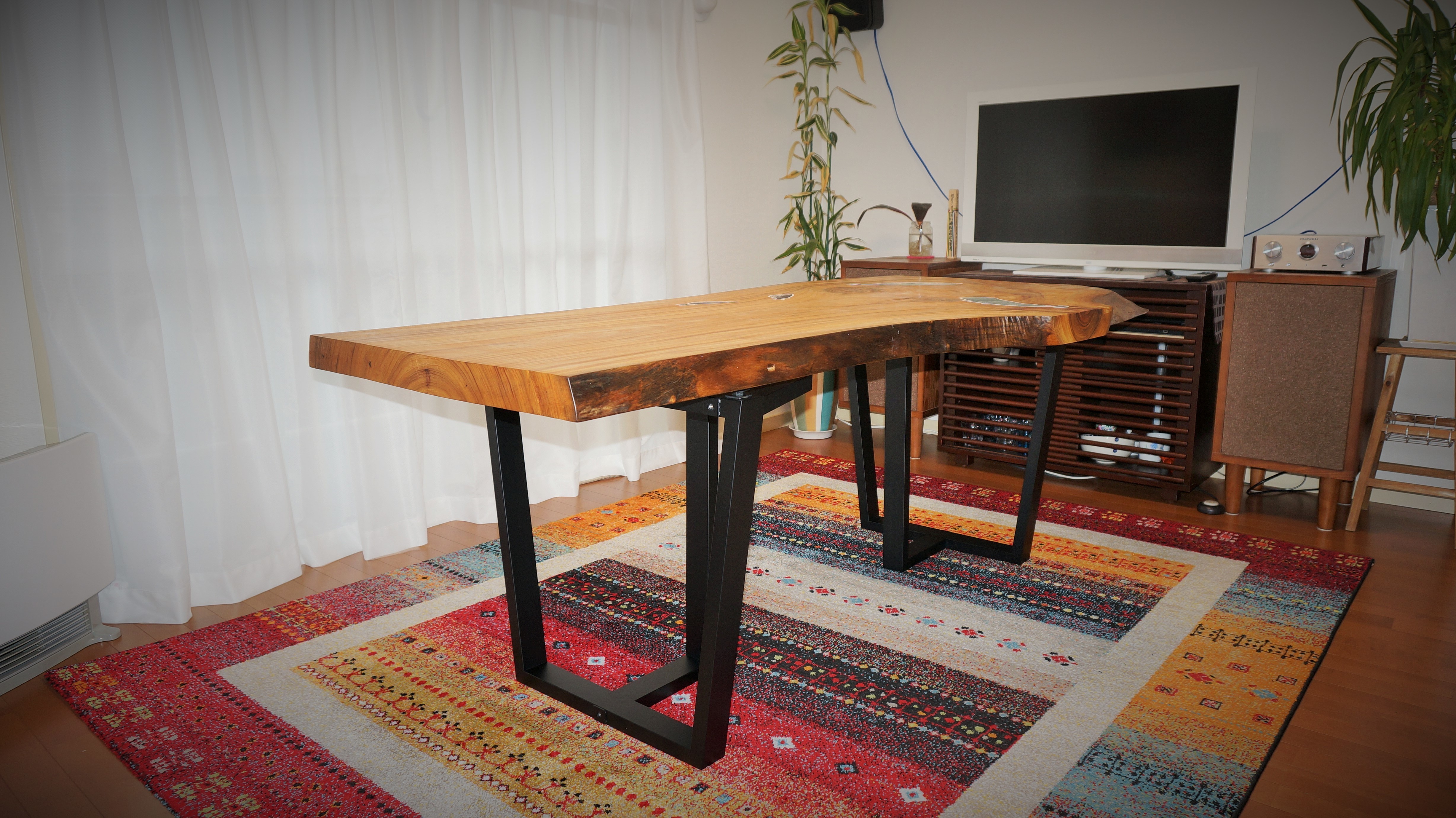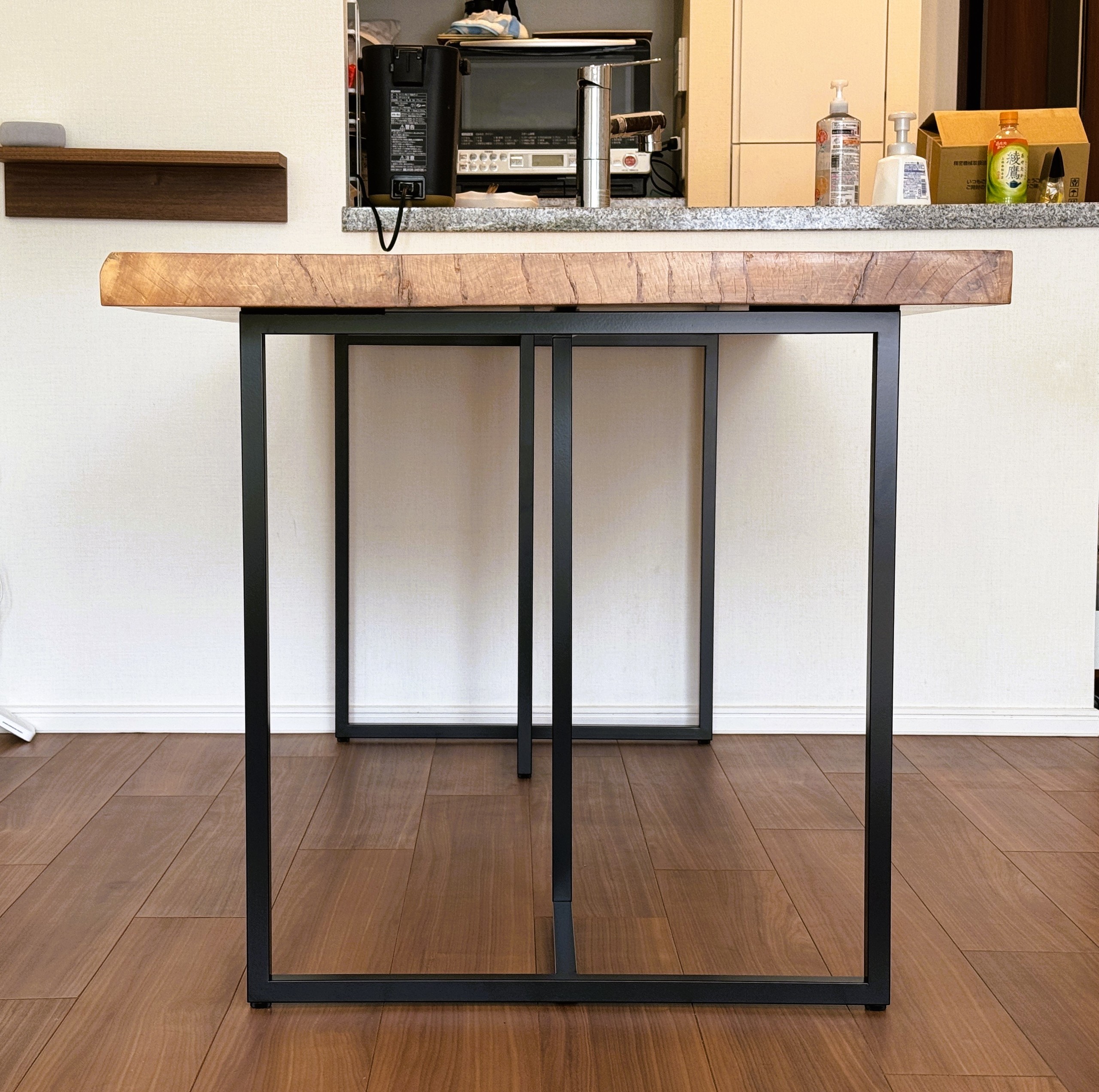 杉並区T様より、一枚板ダイニングテーブル脚のご依頼を頂きました。形状は天板を載せるだけのT字脚のデザイン。天板はトチの一枚板でW1500×D770×厚みが55mm、そして重量は約35kgということでゴツめの角パイプでテーブル脚をお作りになられるのかなと思ったのですが、細い脚で攻めたデザインにされたいということで21×21(mm)角パイプで製作をさせて頂きました。私は仕事柄どうしても安定感を重視した材料チョイスをしてしまうのですが、細いテーブル脚のデザインがお好きな方が最近多いです。今回のT様のケースも安定感が少し心配ではありましたが、問題なく設置完了できたそうなのでよかったです。ちなみにフレームと天板の間はクッションゴムだけで設置されたそうですが、念のためにビス固定用の貫通穴も加工をさせて頂きました。また、ご参考までですがT字型の脚は四角と台形形状を組み合わせた変形デザインもよくご注文頂きます。ご興味ある方はお問合せくださいませ。