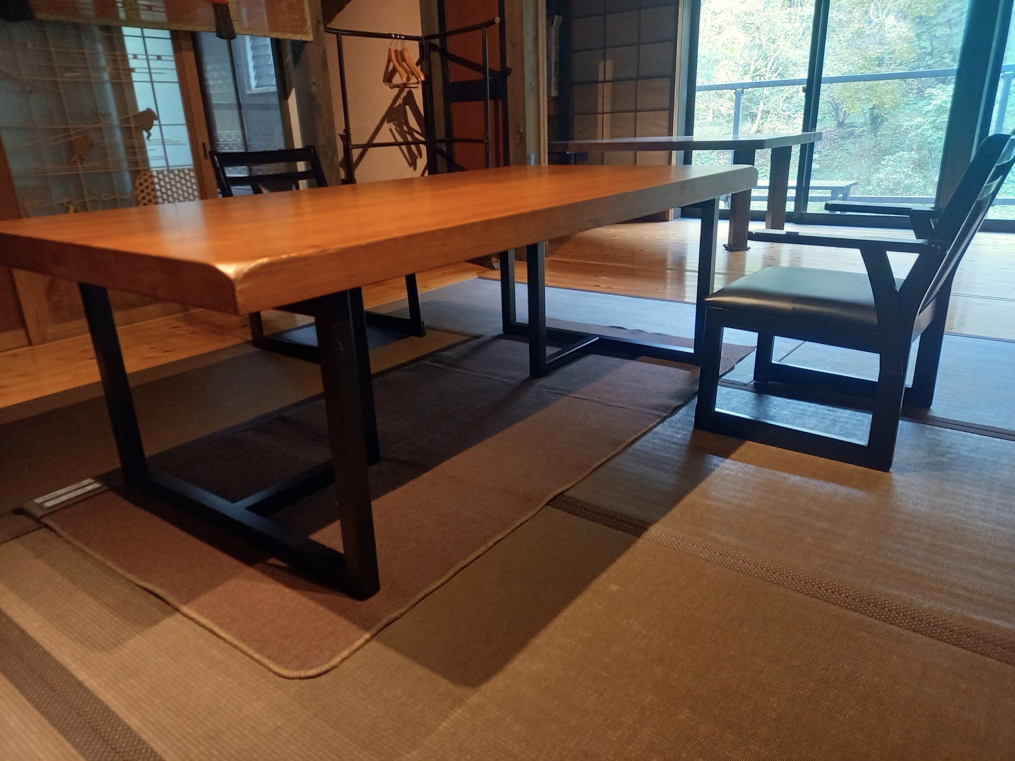 千葉県南房総の山奥秘境にある炭火焼き山海料理のお店、隠れ屋敷 典膳様より、大きな一枚板のテーブル脚のご依頼を頂きました。一枚板のサイズはt=65×W1800×D900(mm)とヘビー級。分厚い高価な木天板の場合、ビス穴を木材にあけることや、そのことによって木材の伸縮でビス穴から木材に亀裂が入るケースも懸念されるため、天板は載せるだけの方が案配がよかったりもします。T字型のテーブル脚と木材の間には5mm厚で少しだけ粘着力のあるクッションゴムを挟み込み、ズレ防止を兼ねました。重量がある天板なので動く危険性は低いです。