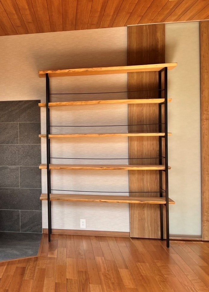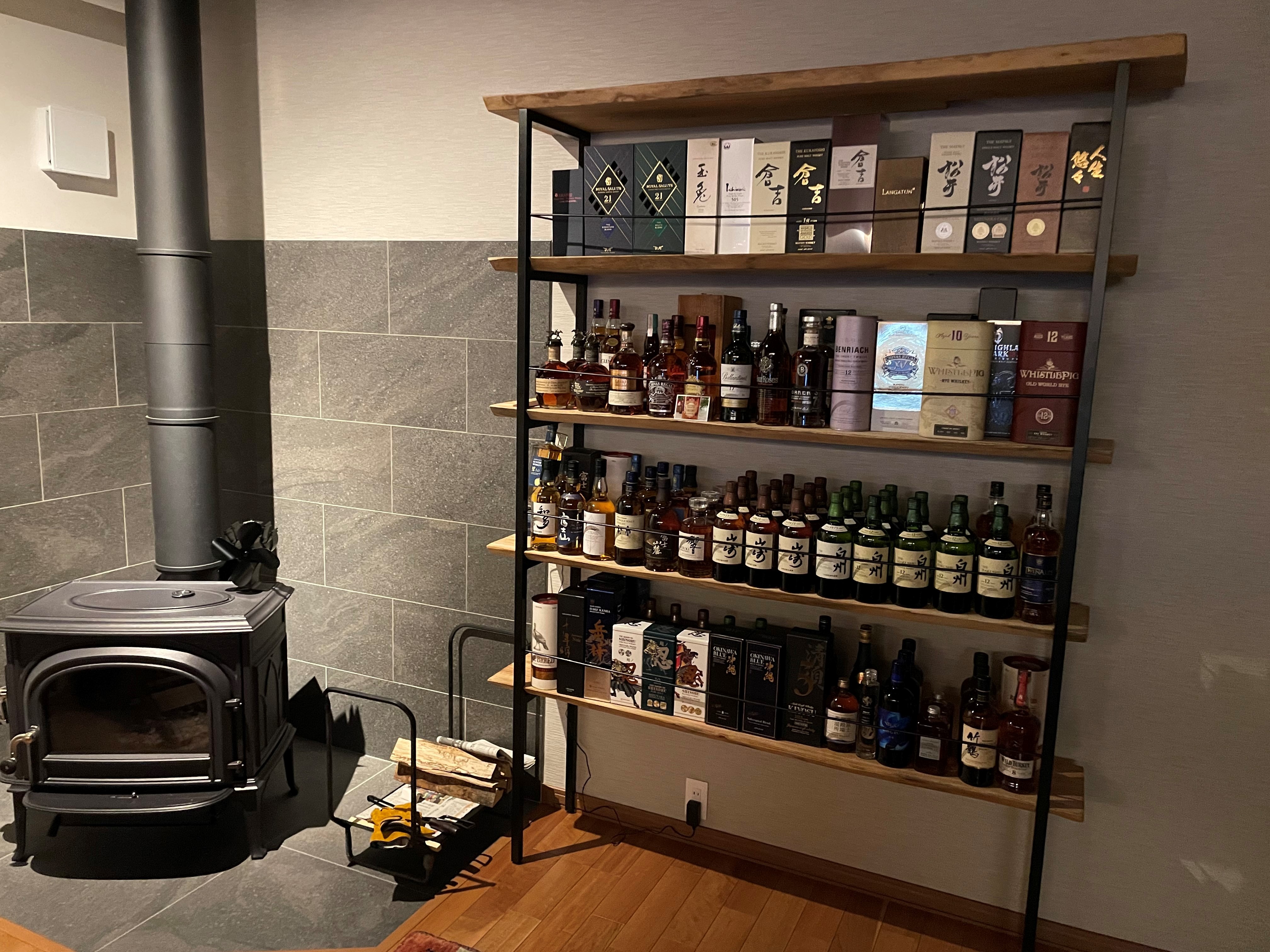 北海道に別荘を建設された某企業の社長、O様より『ウイスキーなどをズラリと並べるボトル棚を作りたいのですよ』というご依頼の元、写真のようなアイアンフレームをオーダー製作させて頂きました。並べられた高級なお酒に目が行ってしまいますが、見て頂きたいのはフレームの方(笑)。基本的な仕様は意外とシンプルで両サイドのハシゴ状の角パイプフレームに木天板をビス固定、という作りです。ポイントはボトルが地震などの際に転倒落下しないように、丸棒の倒れ止めをつけました。両サイドのハシゴフレームにも加工しております。そして棚自体が倒れないように壁面にもビス固定してあるので安心です。