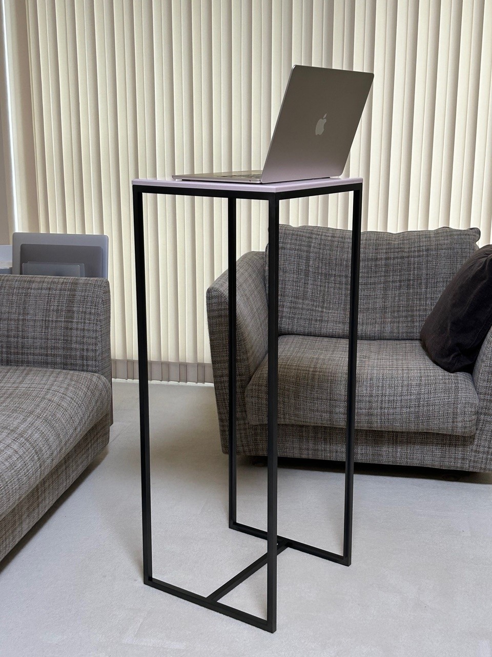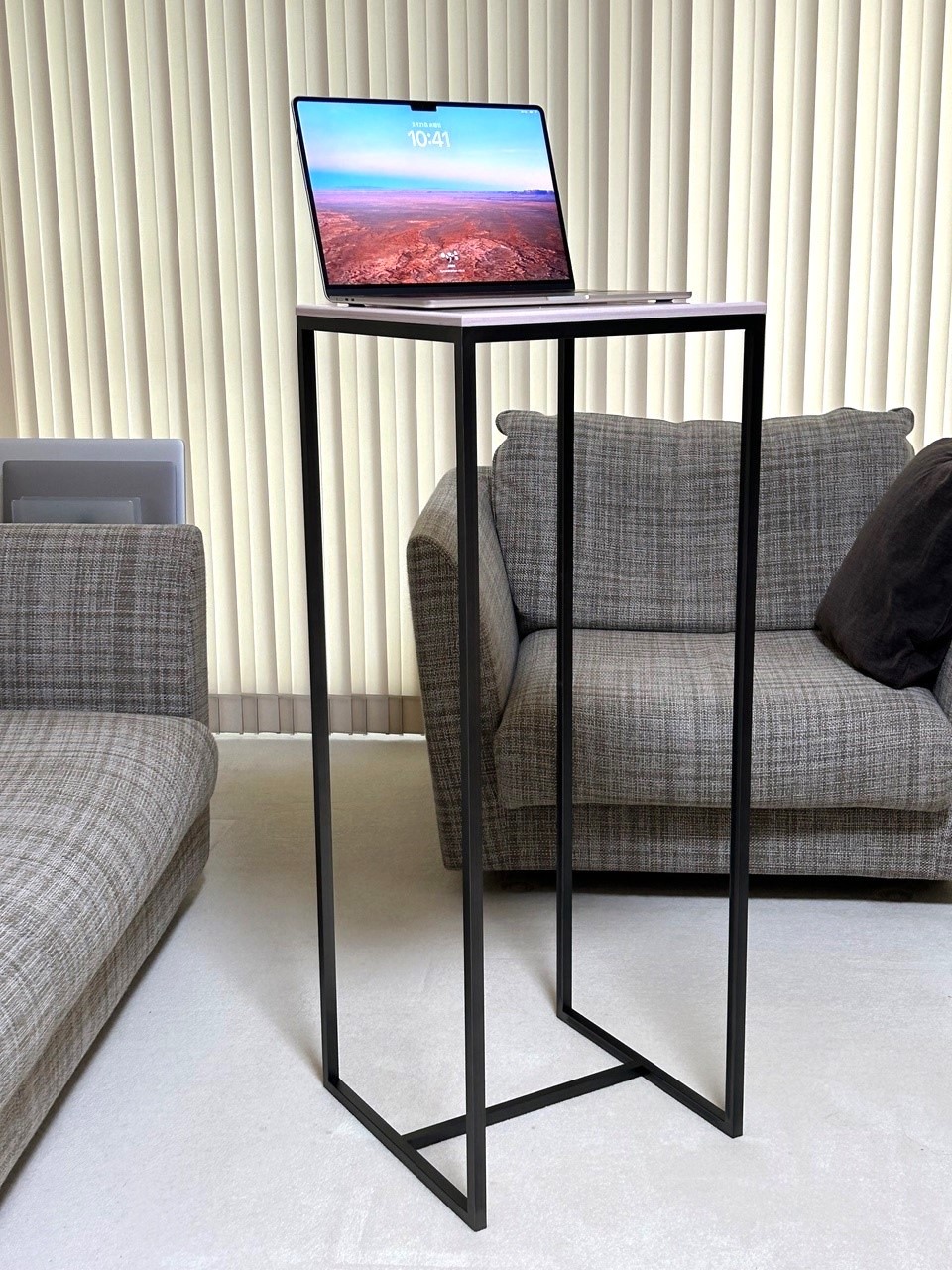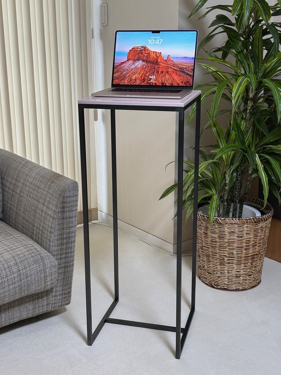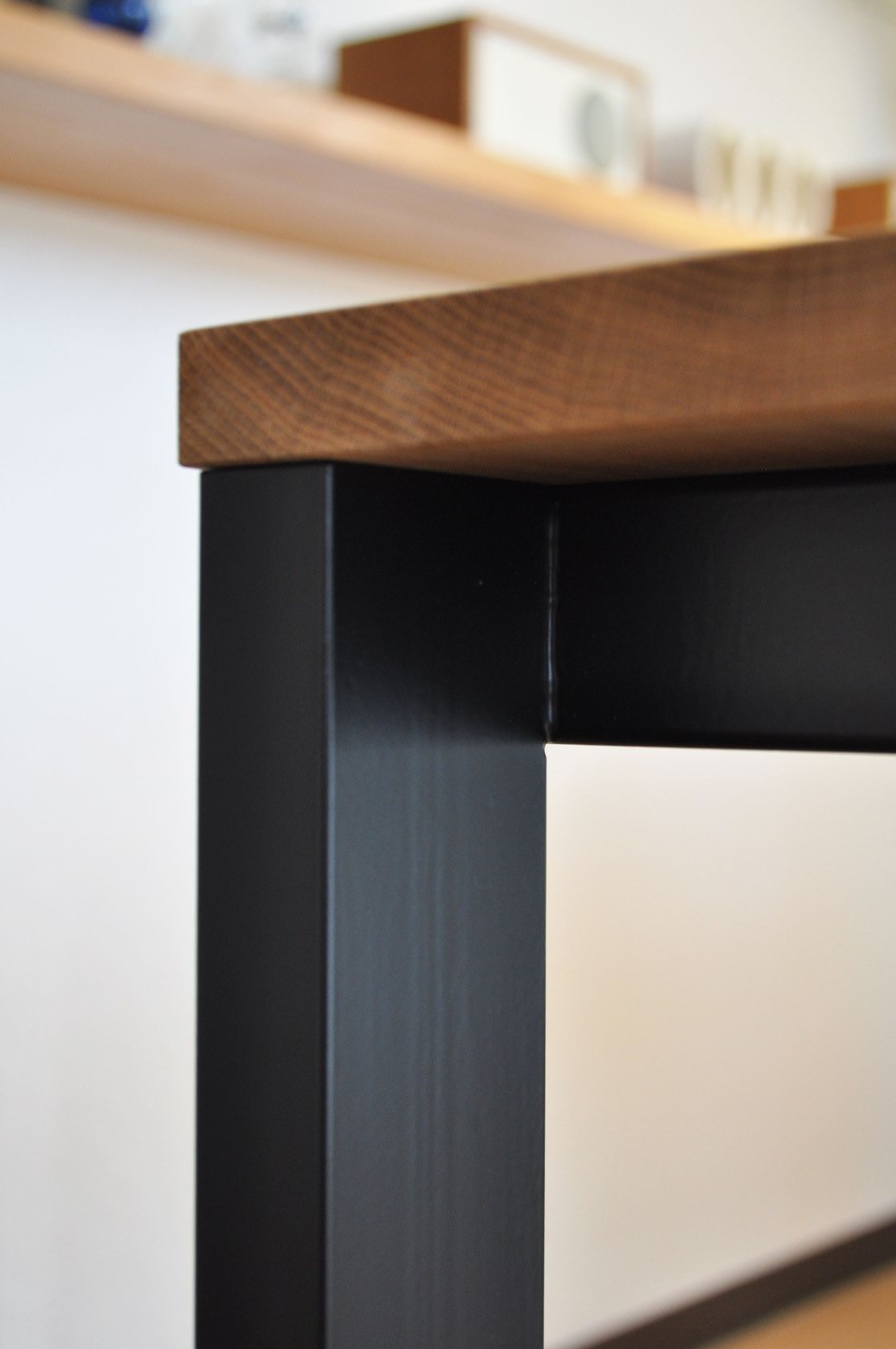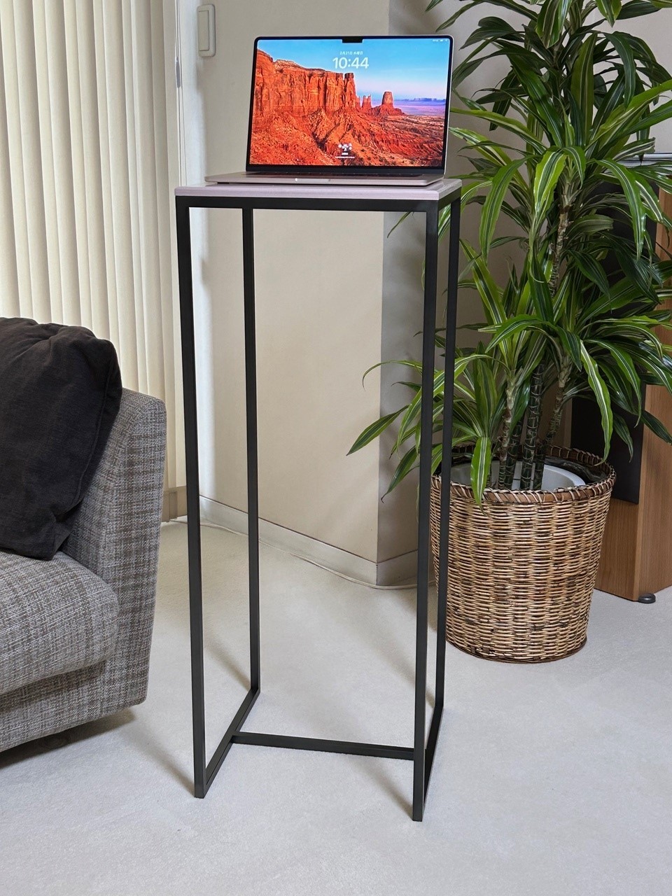 文京区U様より、無駄を極限までそぎ落としたミニマルデザインのスタンディングデスクのご依頼を頂きました。『ノートパソコンだけ置けるスペースを確保し、腰が悪いので立ったまま作業のできるデスクを作りたいのです』とのご依頼。また、簡単に移動できるように軽量化も図りたいとのことで、16×16(mm)角パイプを用いた華奢なフレームで重量は約5.5kgにて製作をさせて頂きました。天板を除いたフレームのサイズはW380×D380×H978(mm)。仕上げの塗装は黒皮風のメラミン焼付塗装で角パイプの下地やサンダー跡がうっすら見えるスケ感のあるブラック塗装です。木天板はU様のハンドメイドでピカピカに仕上げられておりました。モノ作りがお好きなお方でご自宅にボール盤を持っていたり、ワークショップ的なお店で木材のレーザーカットを頼んで鉢植えスタンドを作られてみたりと八王子リフォームのヒロミさんのような方でした。