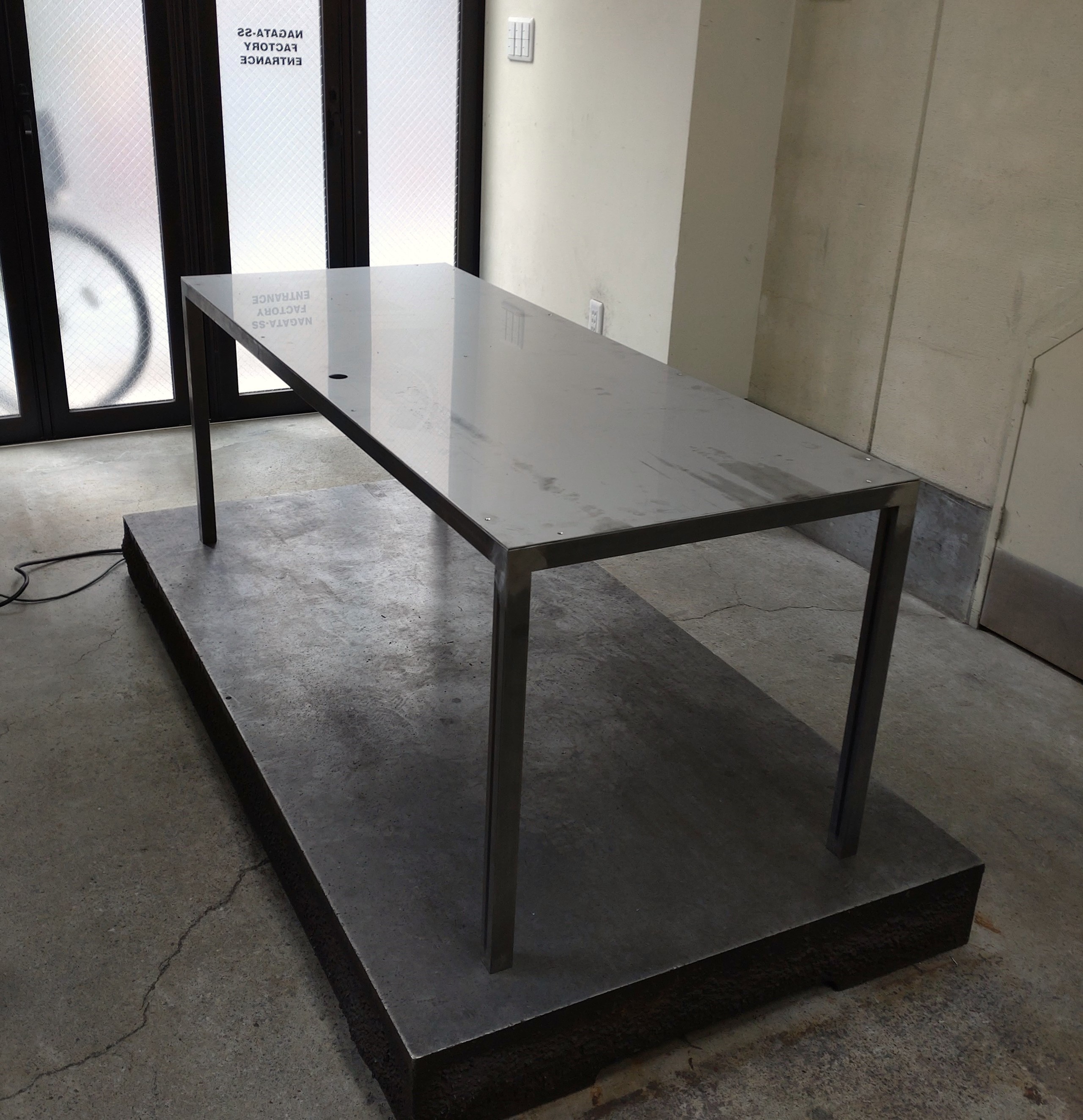 「料理教室用のガス台をピッタリサイズで作りたい」とのご依頼を頂いたのはフードスタイリストとして多くの書籍出版や雑誌のスタイリングもされているダンノマリコ様。ガス台の天板はサビや汚れに強いステンレスの板をバイブレーション仕上げ。フレームは製作コストを抑えるためにスチール角パイプをクリヤー焼付塗装して見た目に統一感を出しました。天板にはガス管を通すために30φの穴加工をしております。フレームの方にタップ加工(ネジ切り)をして天板とビス固定をして完成です。バイブレーション仕上げとは無研磨の板(写真参照)にランダムな円弧状の研磨目を無数につける仕上げ方でキズが目立ちにくく、マットな風合いになります。ミラタップさんなどの高級キッチンカウンタートップの加工方法でも採用されている手法です。既製品ではあまり見かけない理由は、手間がかかるリッチな仕上げなのです。たまに角パイプでもこの仕上げをしてほしいという方がおりますがひたすら研磨するため製作コストが増します。しかし、かっこいいです。弊社工場の看板にも採用しています。
