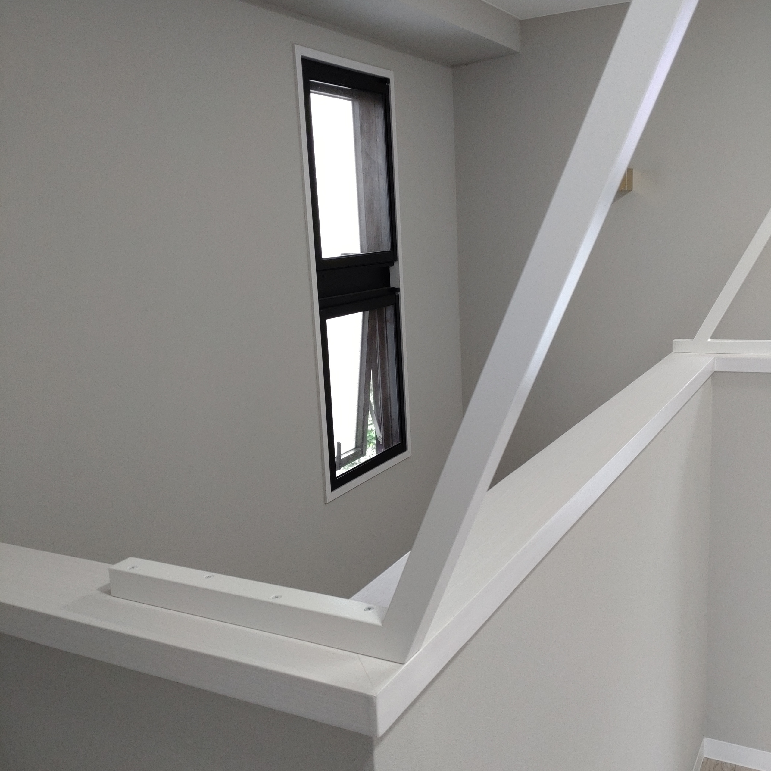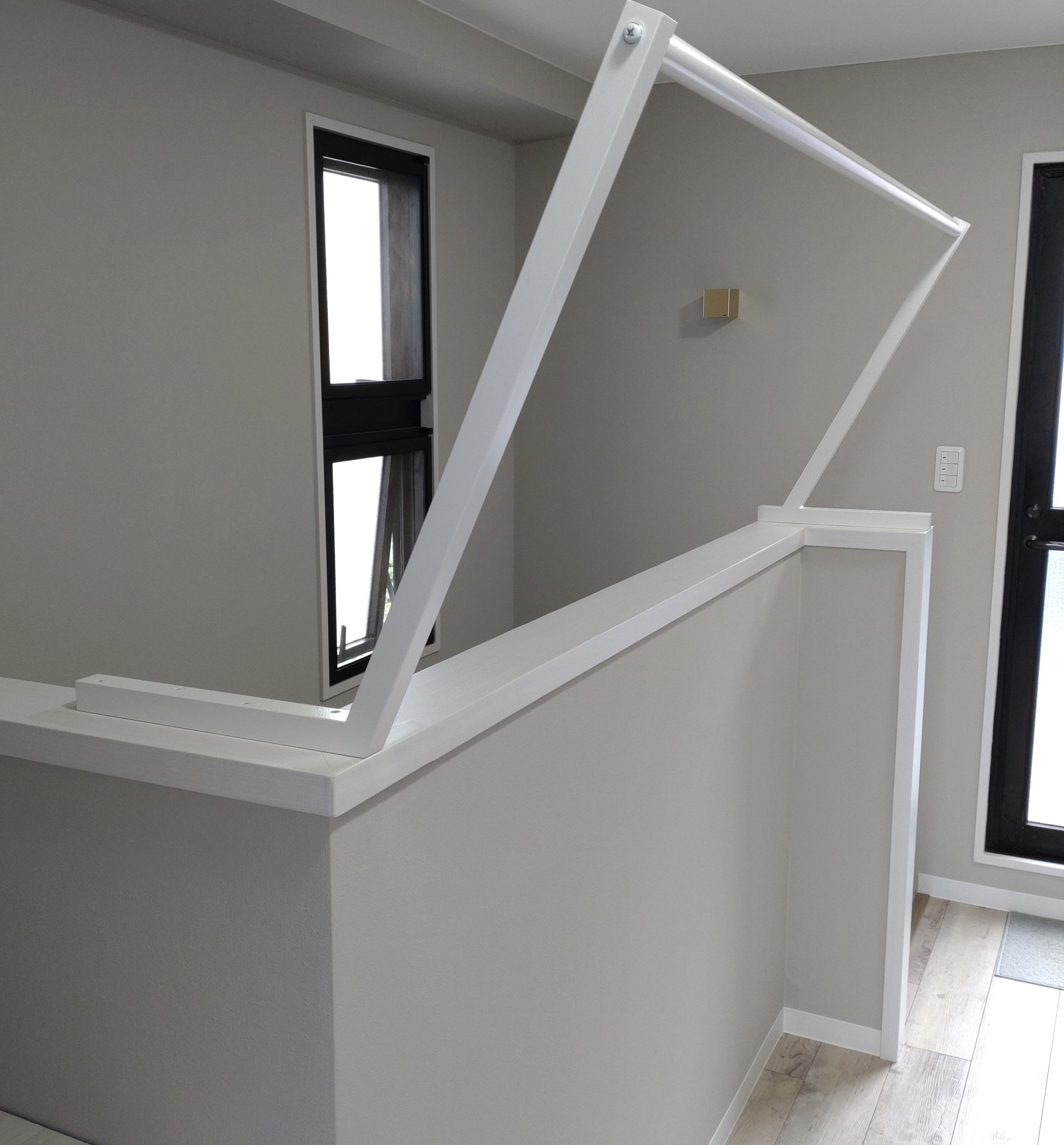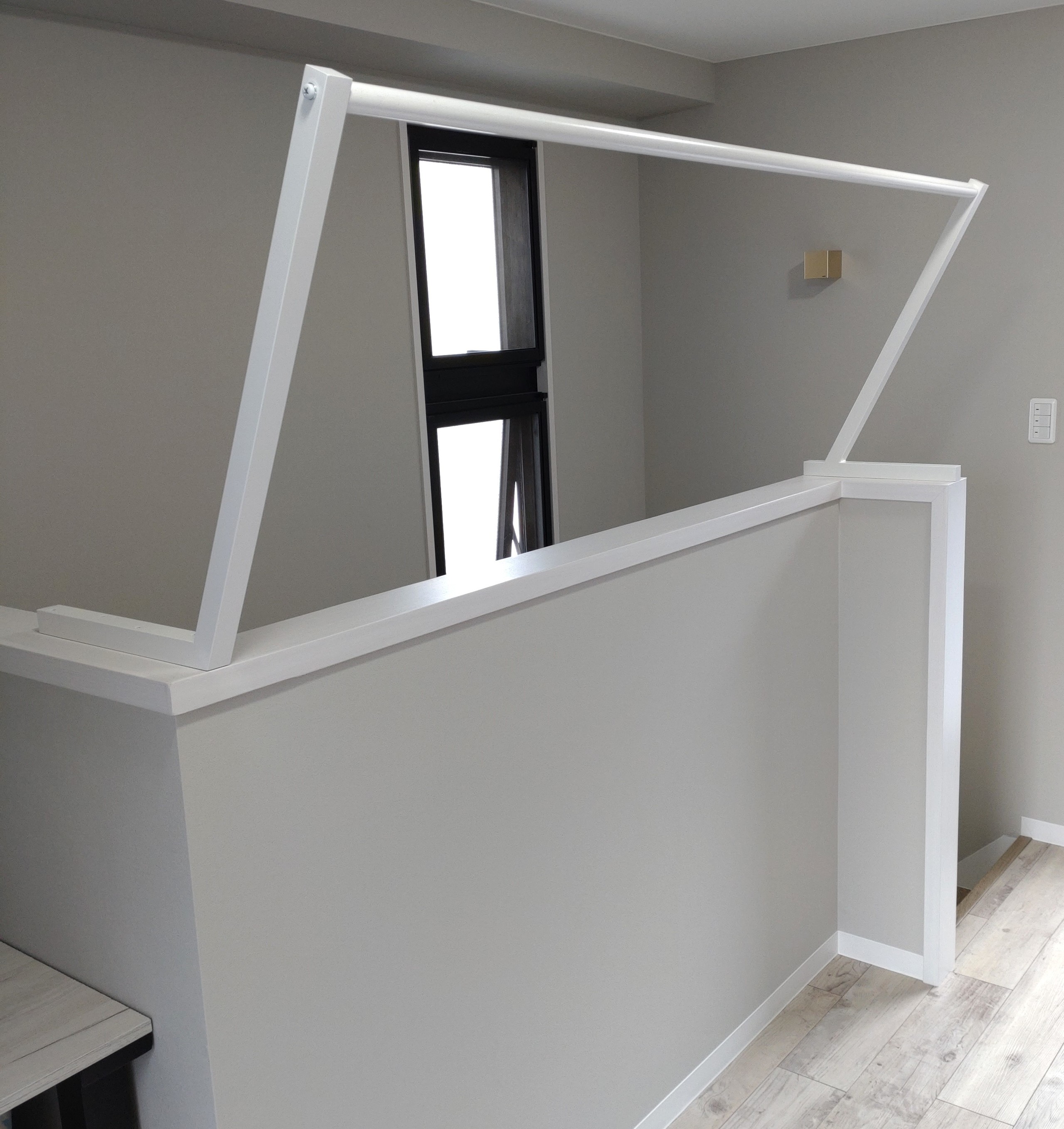 自宅の室内物干しをご紹介いたします。階段を登り切った手すりの笠木に無理矢理な室内ハンガーラックを製作いたしました。我ながらよく考えたなという自画自賛デザインです(笑)。設置前の写真をご覧頂きたいのですが、この廊下スペースがデッドスペースで室内物干しスペースにできないものかと考えに考えた末、このような形状となりました。家族の頭にぶつからない高さ、角度をつけて洋服を引っかけやすい寸法もCADで計算してハンガーパイプを出っ張らせました。モチのロンで壁に洗濯物は触れません。下からサーキュレーターを回しておけば、花粉の時期や梅雨の時期でも洗濯物が快適に乾かせます。我が家の場合、天井にビス固定ができず、手すりの笠木にしかビス固定ができなかったため、苦肉の策で生み出したデザインです。近年はリノベーションブームですのでご家庭のお悩み相談のオーダー金物でも作ってみませんか?